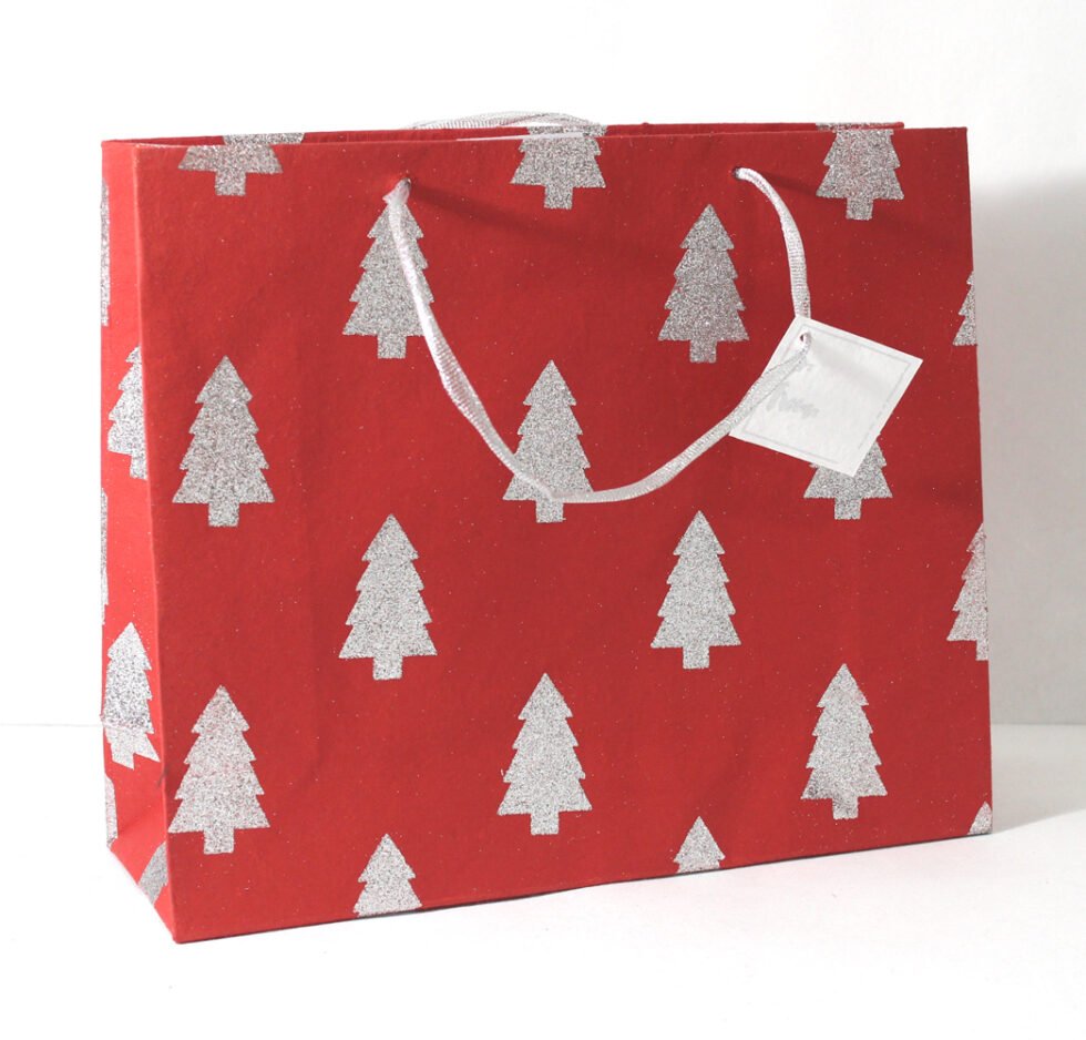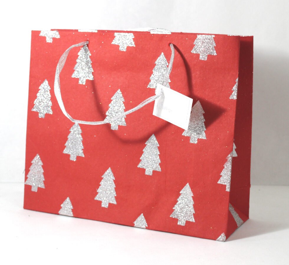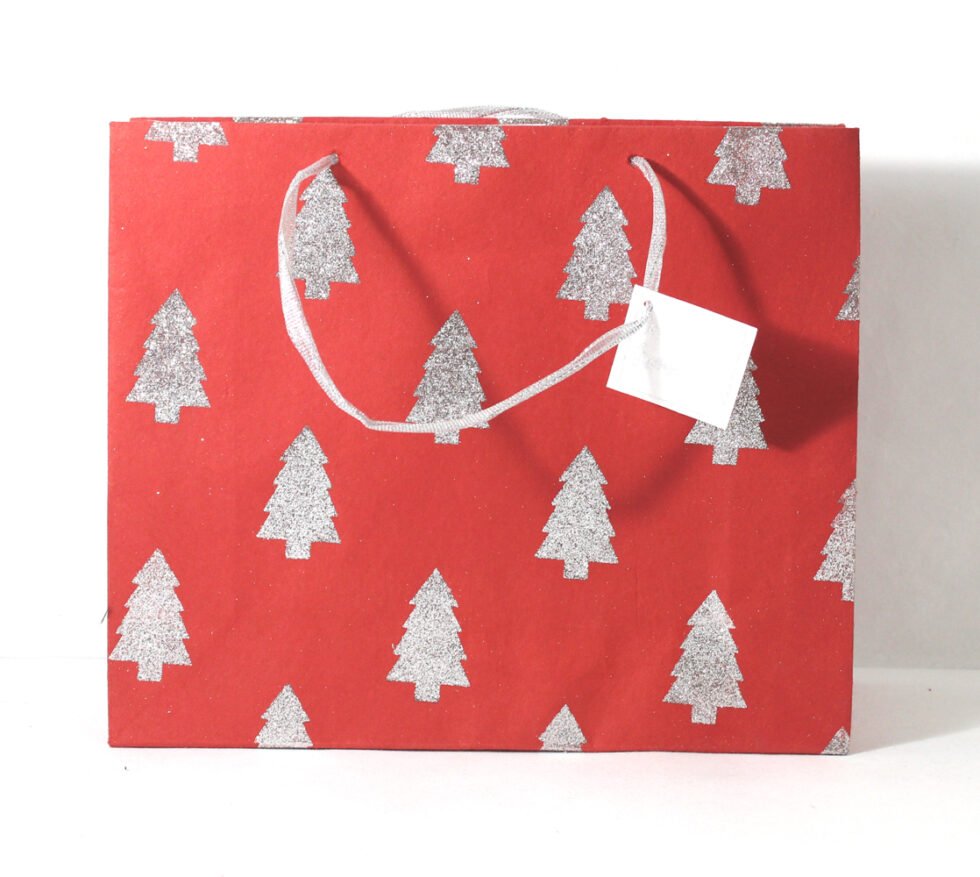A lovely premium gift bag for exclusive use! Thick recycled cotton handmade paper with metallic silver glitter print all around. Matching satin ribbon handles are given with matching gift tag. Further, bottom and collars of the bags are strengthened up by providing card sheets inside