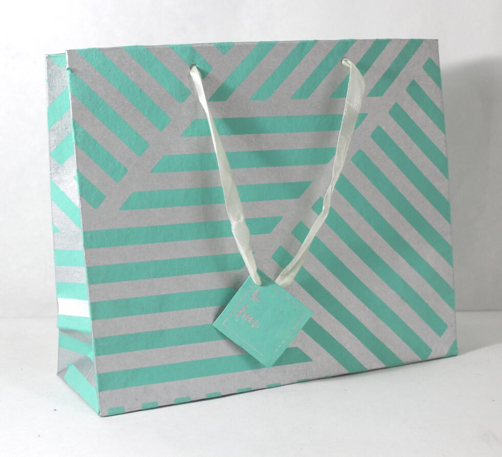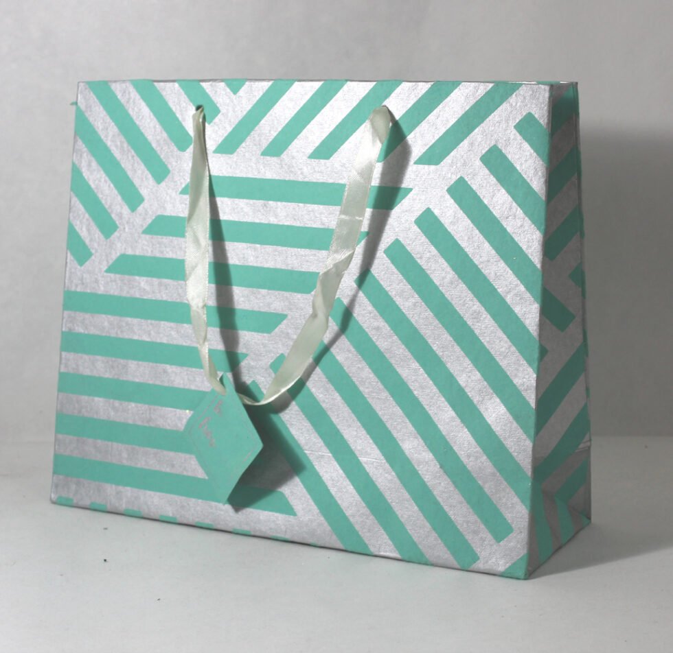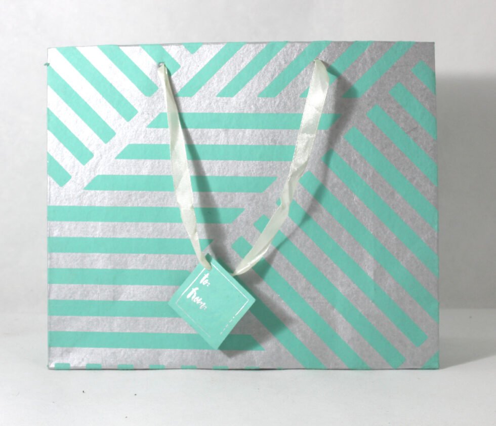 A lovely premium gift bag for exclusive use! Thick recycled cotton handmade paper with metallic silver print all around. Matching satin ribbon handles are given with matching gift tag. Further, bottom and collars of the bags are strengthened up by providing card sheets inside.