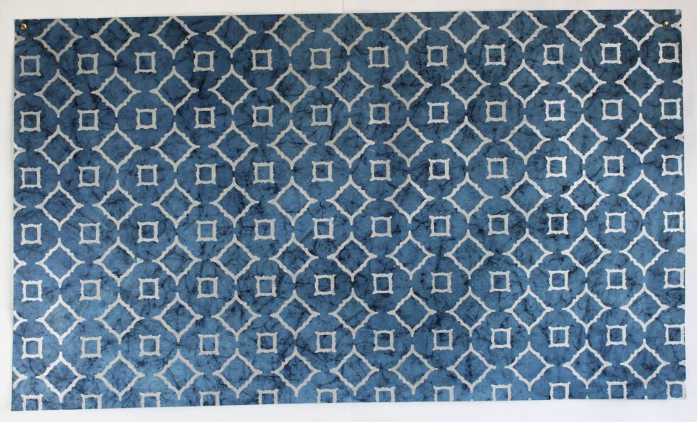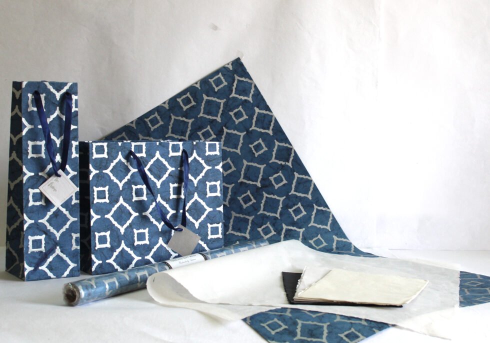 Metallic silver print on blue batik 100 GSM recycled cotton paper. Wood fee, acid free handmade paper. A premium gift wrap for all kind of occasions rolled up on a paper tube. Can be shipped flat also, double folded or just flat. Can be supported by other packing accessories like bags, boxes, tissue papers, tags & labels – a wonderful packing range in environment friendly paper. Can definitely be customized in terms of sizes, colours, logo & other details.