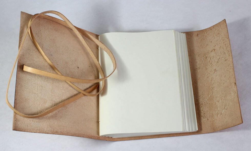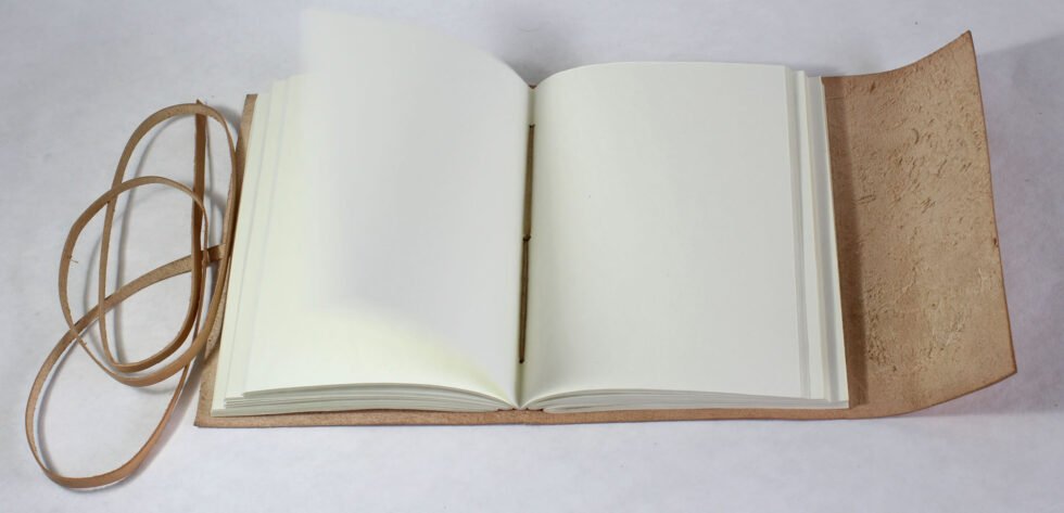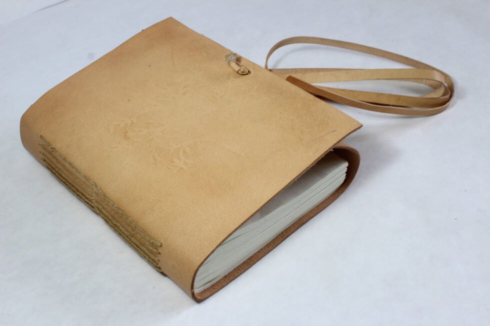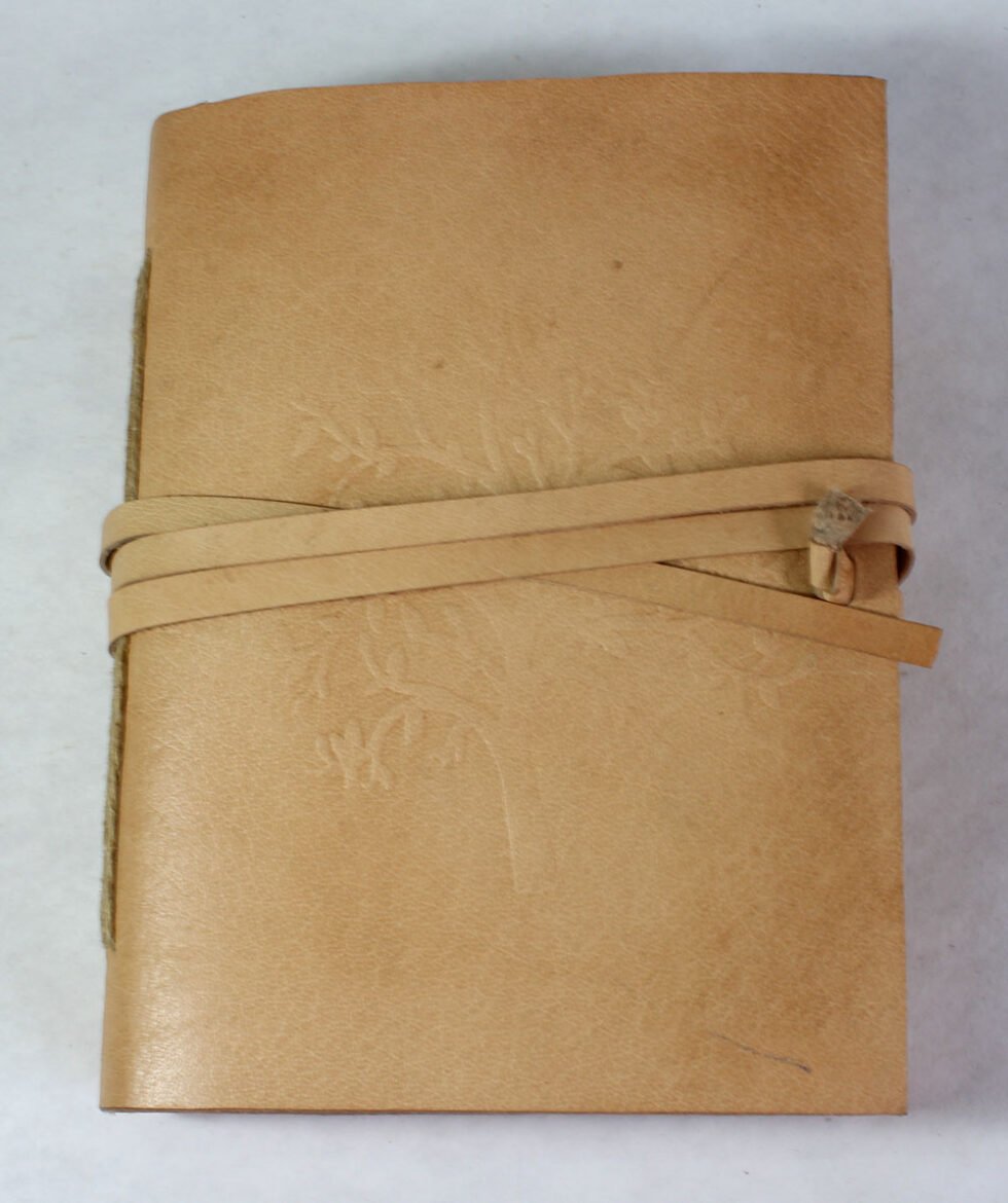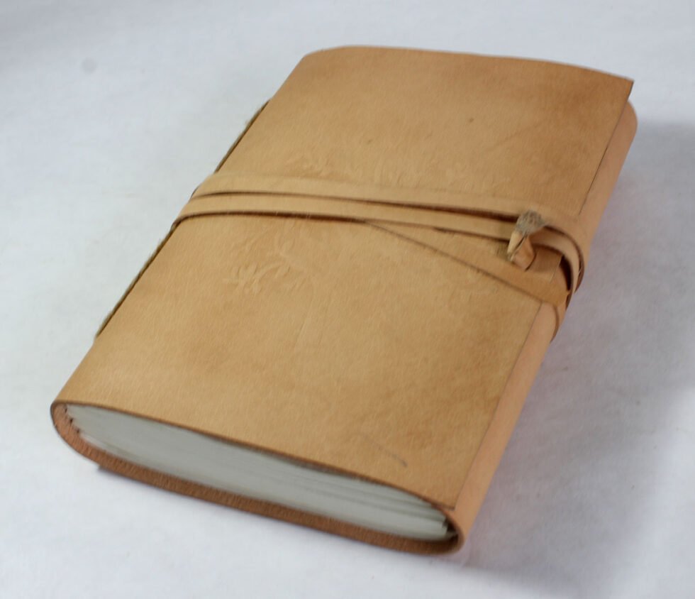 Natural goat TC leather journal with embossed tree design and 2″ flap strap closure. Includes 120 sheets (240 pages) of handmade, recycled cotton paper — a perfect eco-friendly vintage gift.