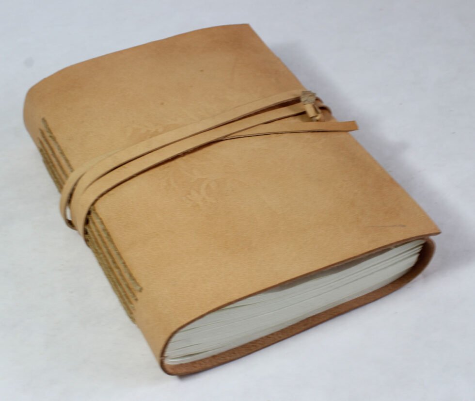 Natural colour genuine leather bound journal with goat TC. Front is having embossed tree design and a flap of around 2″ is provided on the other side of the journal for a perfect closure with the help of same colour leather strap. Inside are 120 sheets / 240 pages of recycled cotton paper – handmade. A perfect green life style present with gypsy and rugged look in vintage style.