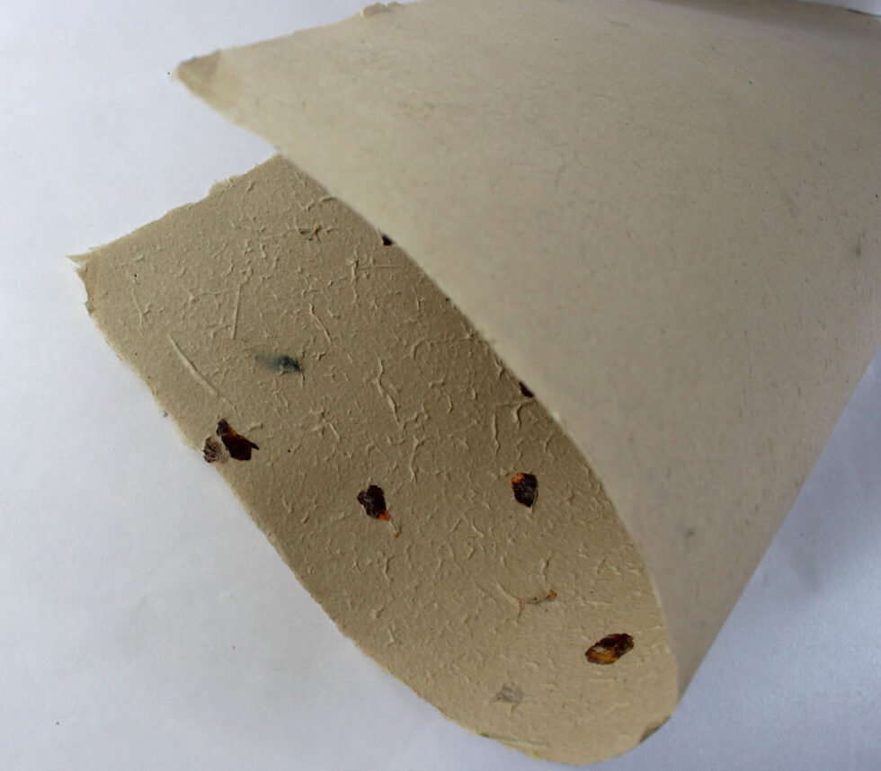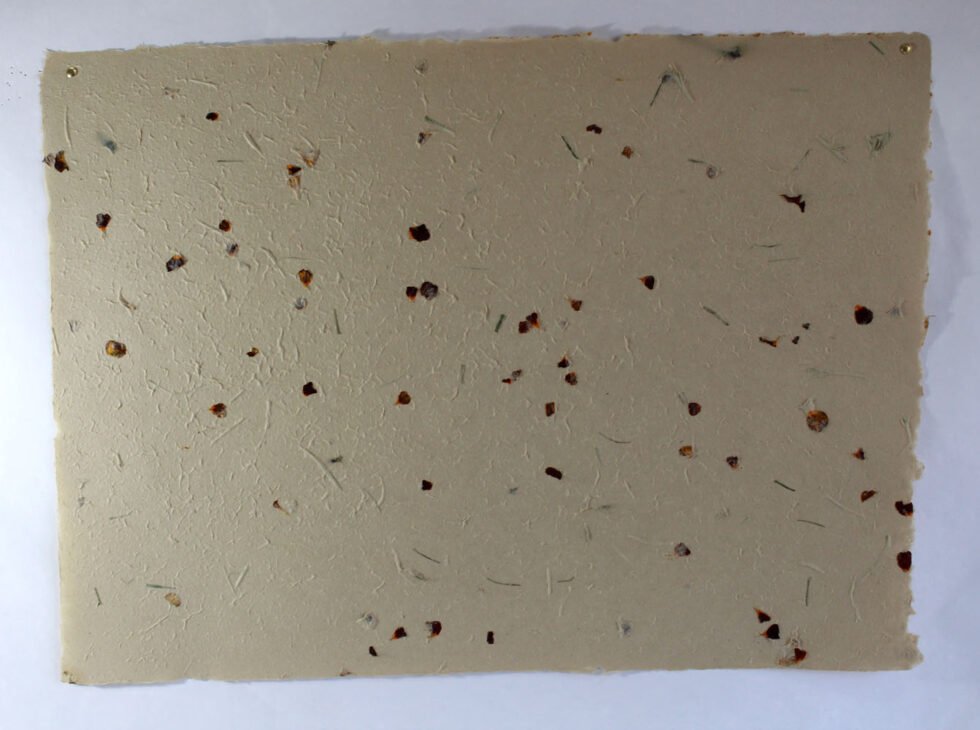 80 GSM natural color ‘Garden Sheet’ from 100% Hemp fiber, Cannabis. With uneven surface and waves all around on the one side of the sheet, paper looks exquisite and rich for multiple uses like gift wrap, art & craft, notebook & boxes covers and even premium shopping bag. Flower petals and fine chopped grass are mottled into the pulp before forming the Garden Sheet.