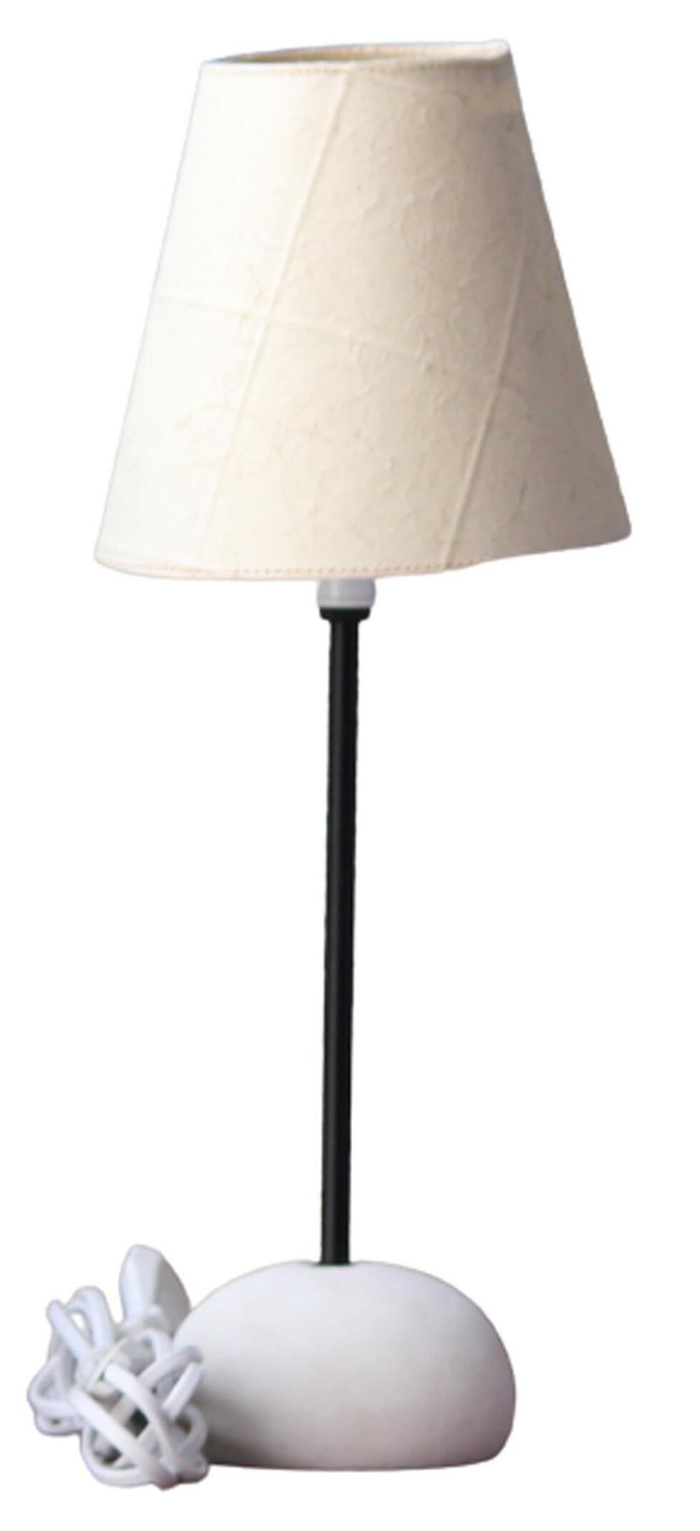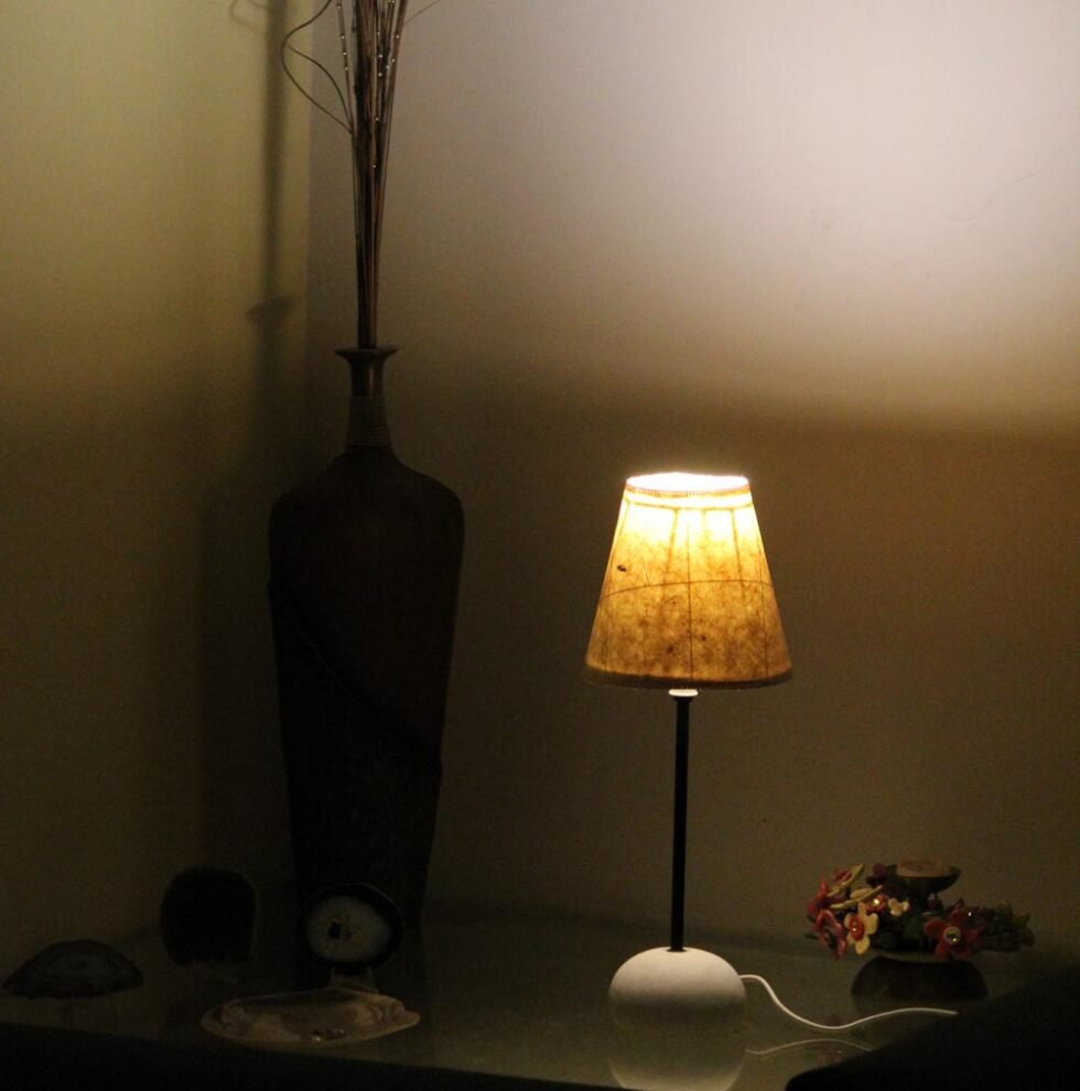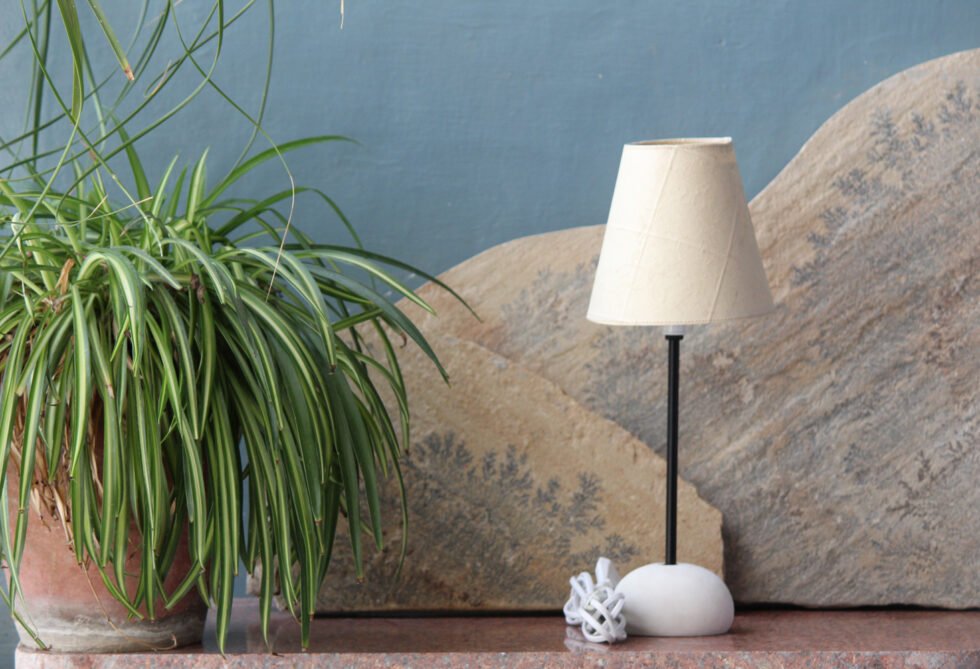 Lampshade from 100% Hemp fiber organic paper – purely recycled & handmade. A truly aesthetic décor catering to high class taste satisfying environmental concerns. Handcrafted by our premium artisans for the top quality international markets. A thin lining of acetate is given underneath the paper for the durability of the shade! The light shimmering out is so unique and carries a classy theme for any type of room / balcony / garden & bar. Tiny incursions of the dyed or natural Hemp fiber along with sandwiched cotton thread in between paper sheets release spectacular light around. Shade supported by a thin wrought iron pipe as stand. On the top is the standard bulb holder while for the base there is sturdy white high quality marble 0.750 kg stone in oval shape! The lamp looks stunning yet simple – a wonderful handcrafted piece for elegant décor. A 2 meter long wire is given to its sturdy marble base with on / off switch facility.