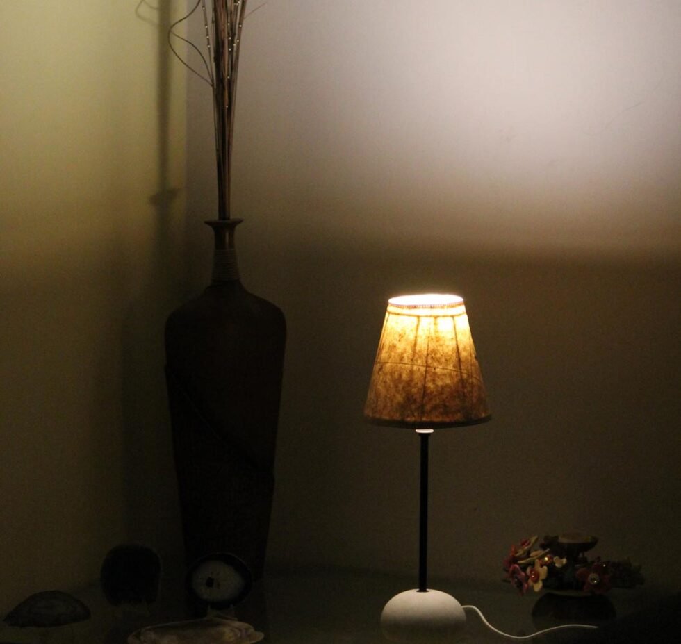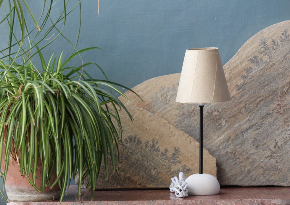 Lampshade from 100% Hemp fiber organic paper – purely recycled & handmade. A truly aesthetic décor catering to high class taste satisfying environmental concerns. Handcrafted by our premium artisans for the top quality international markets. A thin lining of acetate is given underneath the paper for the durability of the shade! The light shimmering out is so unique and carries a classy theme for any type of room / balcony / garden & bar. Tiny incursions of the dyed or natural Hemp fiber along with sandwiched cotton thread in between paper sheets release spectacular light around. Shade supported by a thin wrought iron pipe as stand. On the top is the standard bulb holder while for the base there is sturdy white high quality marble 0.750 kg stone in oval shape! The lamp looks stunning yet simple – a wonderful handcrafted piece for elegant décor. A 2 meter long wire is given to its sturdy marble base with on / off switch facility.
