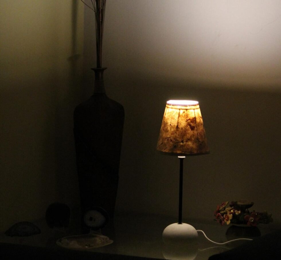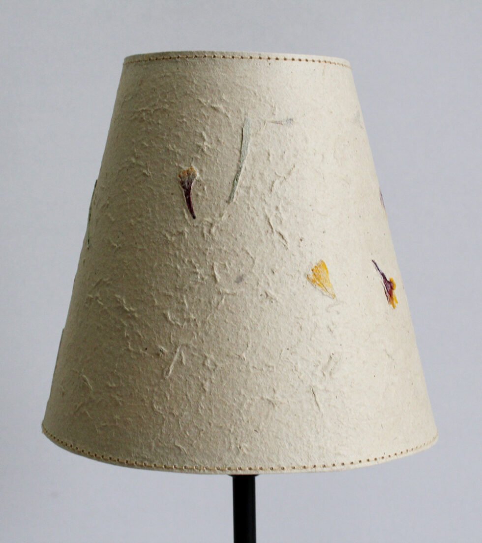 Lampshade from 100% Hemp fiber organic paper – purely recycled & handmade. A truly aesthetic décor catering to high class taste satisfying environmental concerns. Handcrafted by our premium artisans for the top quality international markets. A thin lining of acetate is given underneath the paper for the durability of the shade! The light shimmering out is so unique and carries a classy theme for any type of room / balcony / garden & bar. Tiny incursions of the dyed or natural Hemp fiber along with the grass & flower petals release spectacular light around. Shade supported by a thin wrought iron pipe as stand. On the top is the standard bulb holder while for the base there is sturdy white high quality marble 0.750 kg stone in oval shape! The lamp looks stunning yet simple – a wonderful handcrafted piece for elegant décor. A 2 meter long wire is given to its sturdy marble base with on / off switch facility.
