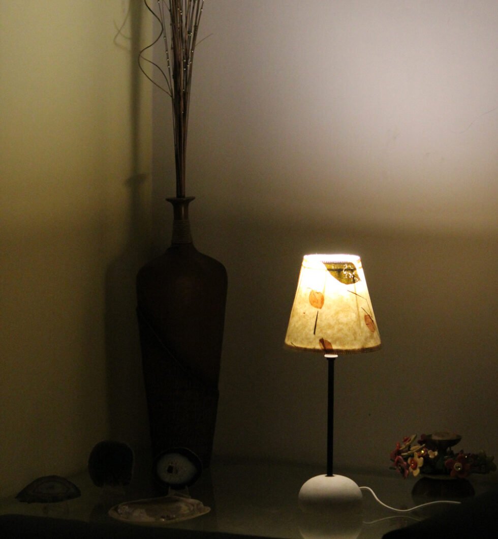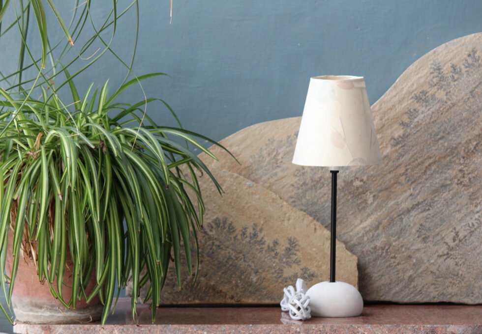 Lampshade from 100% Hemp fiber organic paper – purely recycled & handmade. A truly aesthetic décor catering to high class taste satisfying environmental concerns. Handcrafted by our premium artisans for the top quality international markets. A thin lining of acetate is given underneath the paper for the durability of the shade! The light shimmering out is so unique and carries a classy theme for any type of room / balcony / garden & bar. Tiny incursions of the dyed or natural Hemp fiber along with the grass & flower petals release spectacular light around. Shade supported by a thin wrought iron pipe as stand. On the top is the standard bulb holder while for the base there is sturdy white high quality marble 0.750 kg stone in oval shape! The lamp looks stunning yet simple – a wonderful handcrafted piece for elegant décor. A 2 meter long wire is given to its sturdy marble base with on / off switch facility.