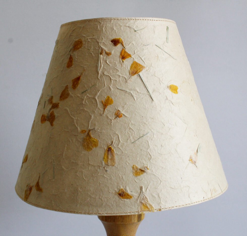 Lampshade from 100% Lokta fiber organic paper – purely recycled & handmade. A truly aesthetic décor catering to high class taste satisfying environmental concerns. Handcrafted by our premium artisans for the top quality international markets. A thin lining of acetate is given underneath the paper for the durability of the shade! The light shimmering out is so unique and carries a classy theme for any type of room / balcony / garden or a bar. Tiny incursions of the dyed or natural Lokta fiber, grass & flower petals and its paper is having ancient Buddhist / Himalayan history and release spectacular light around. Shade supported by classy handcrafted wooden stand made of exclusive mango wood -further treated with better finish and carefully polished for the durability. A 2 meter long wire is given to its sturdy wooden base with on / off switch facility.