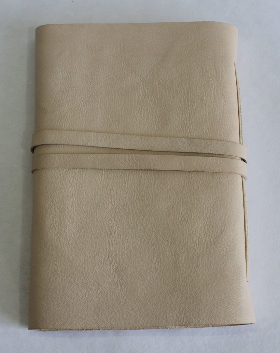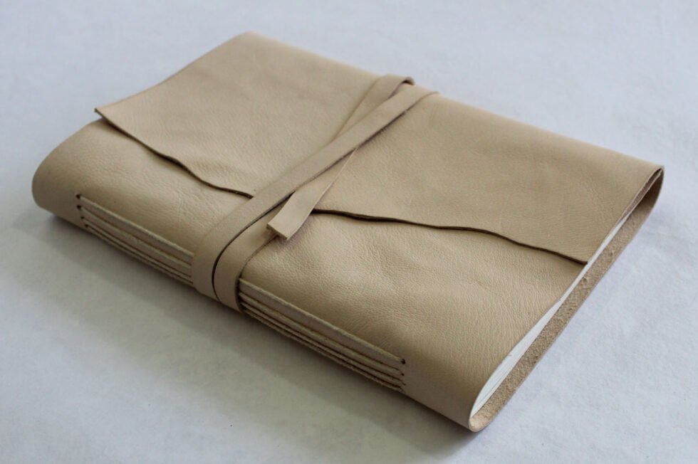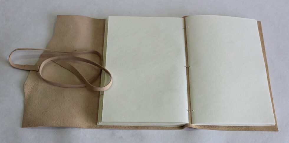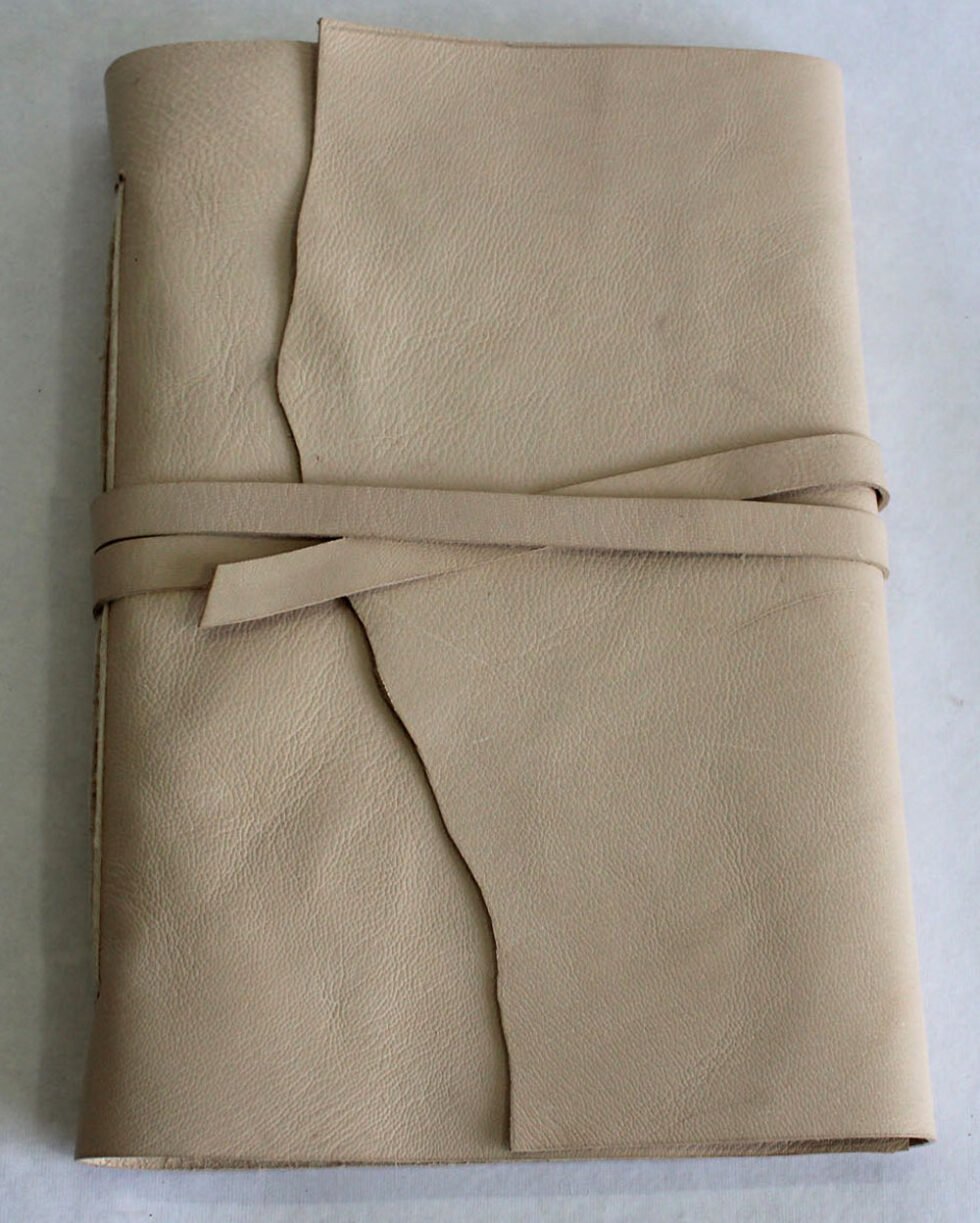 Natural shade genuine goat leather journal. Gypsy looking rustic journal with a zig zag flap of 4′-5′ around it for the closure, supported by a matching strap. Hand crafted journal with 100 hard bound sheets / 200 pages. Paper is recycled cotton handmade. Wood free – acid free, lovely to write upon.