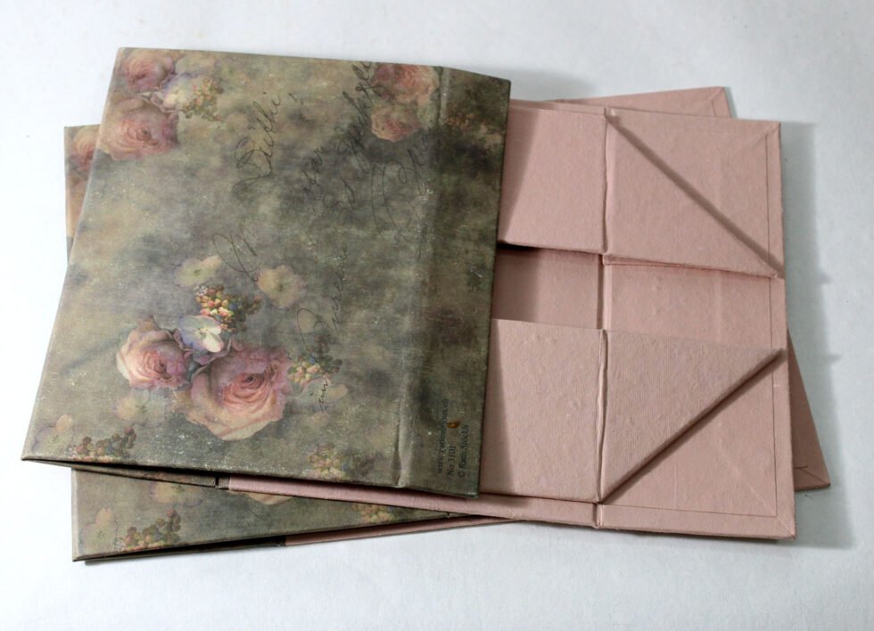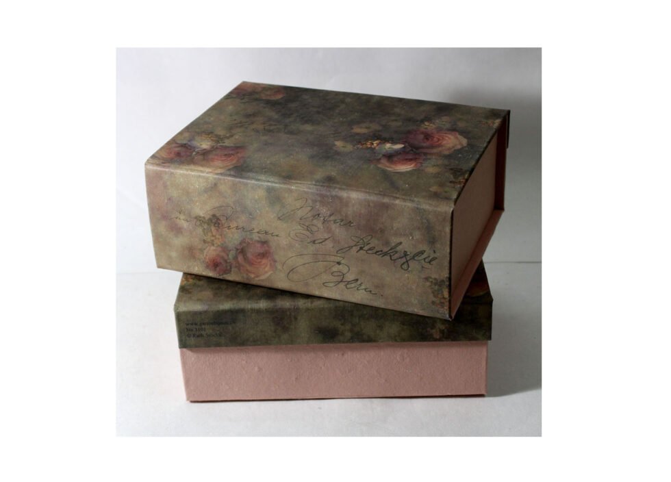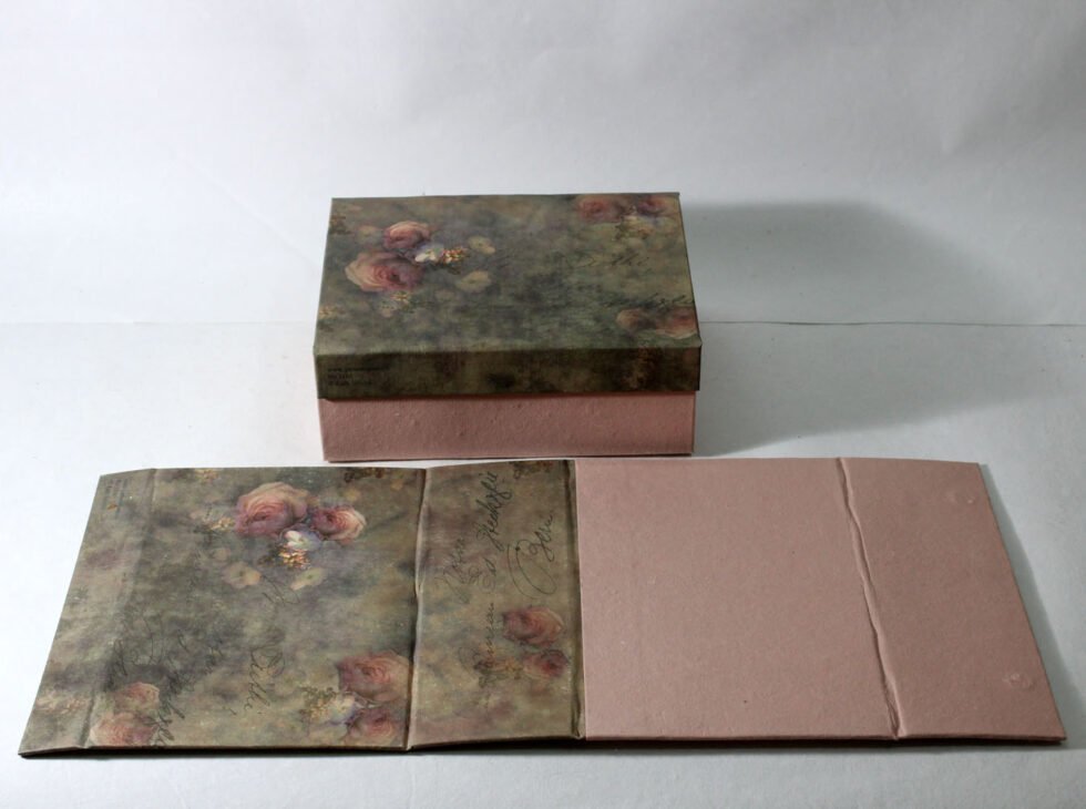 Solid box made of card boards and offset printed handmade paper. Comes as flat as a file / folder, but can easily be shaped up into a solid box with magnetic closure. An ideal packaging for small shops / boutiques, with not much storing place required. Transportation and wear & tear expenses are very less because of a very less volume unlike conventional solid boxes.