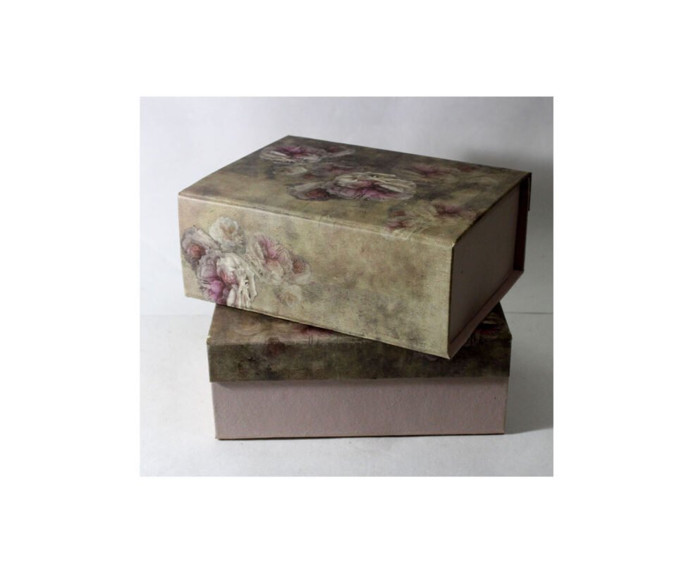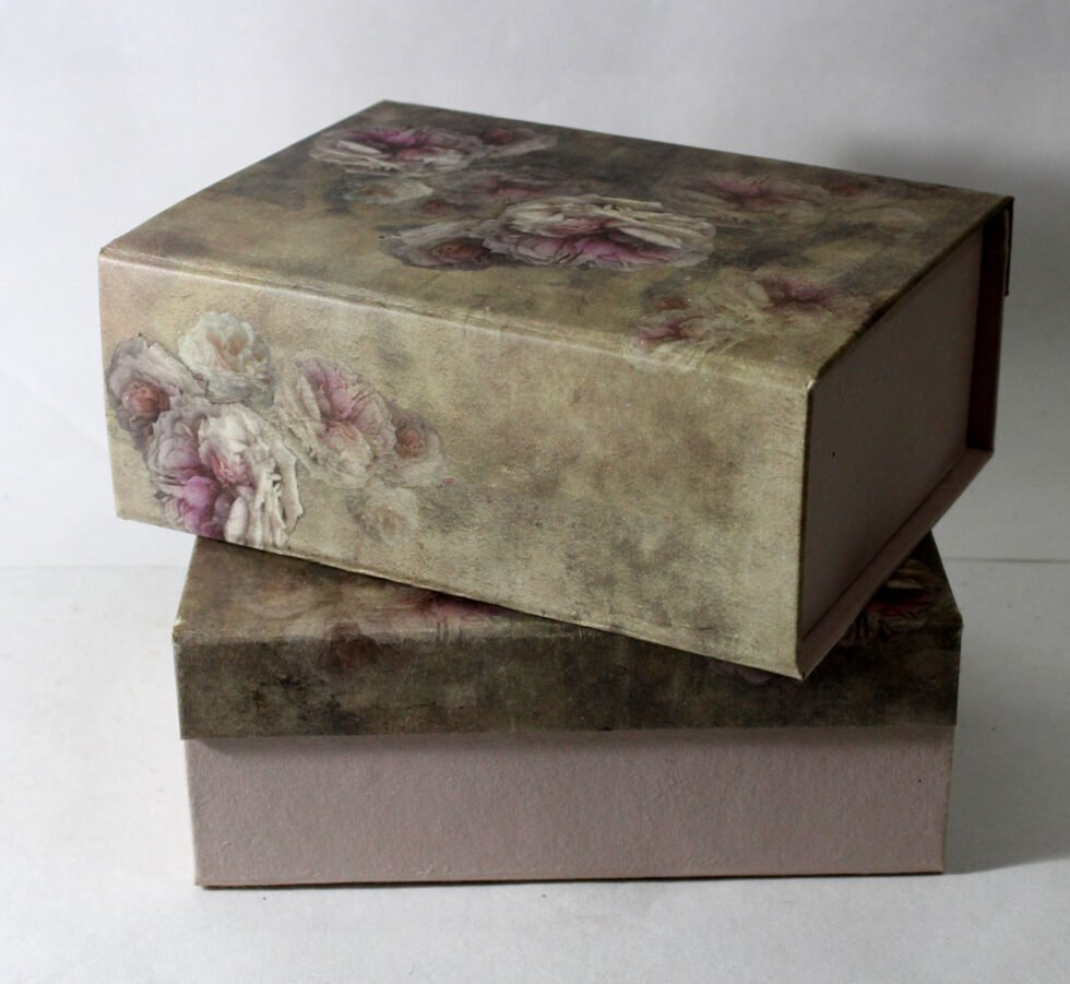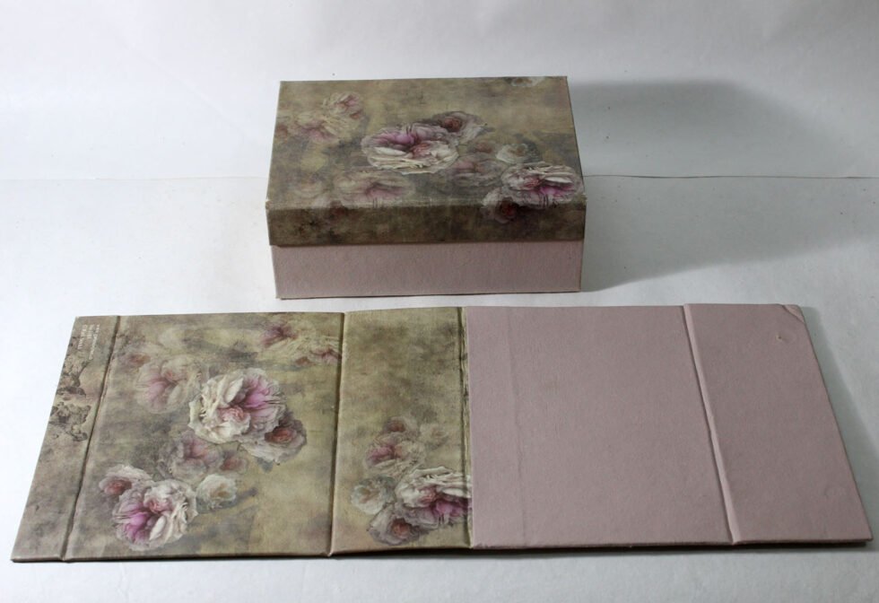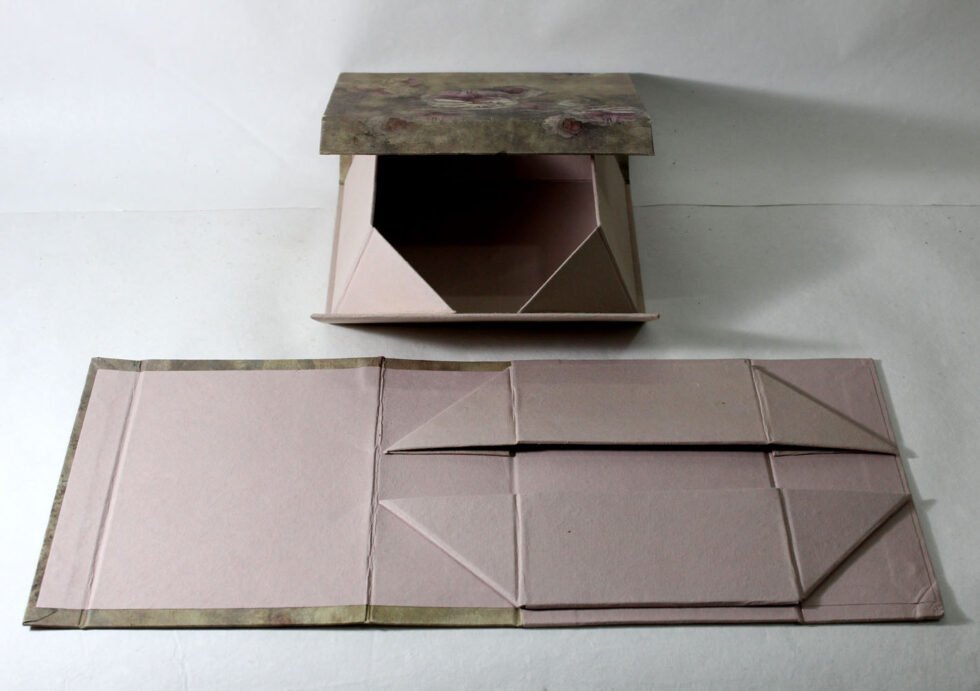 Solid box made of card boards and offset printed handmade cotton. Comes as flat as a file / folder, but can easily be shaped up into a solid box with magnetic closure. An ideal packaging for small shops / boutiques, with not much storing place required. Transportation and wear & tear expenses are very less because of a very less volume unlike conventional solid boxes.