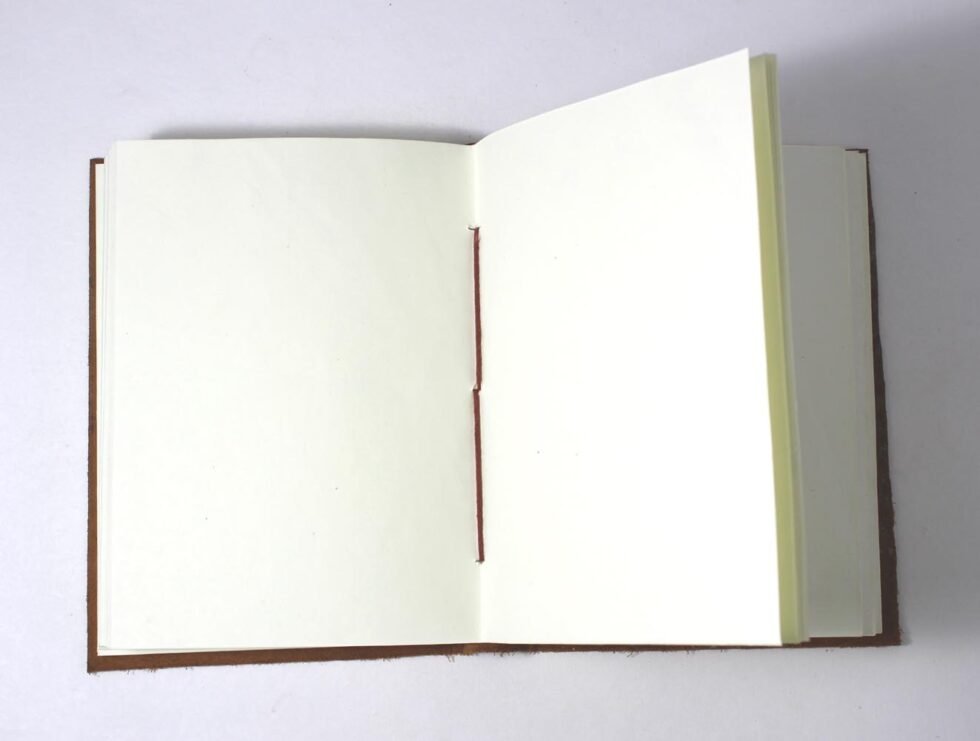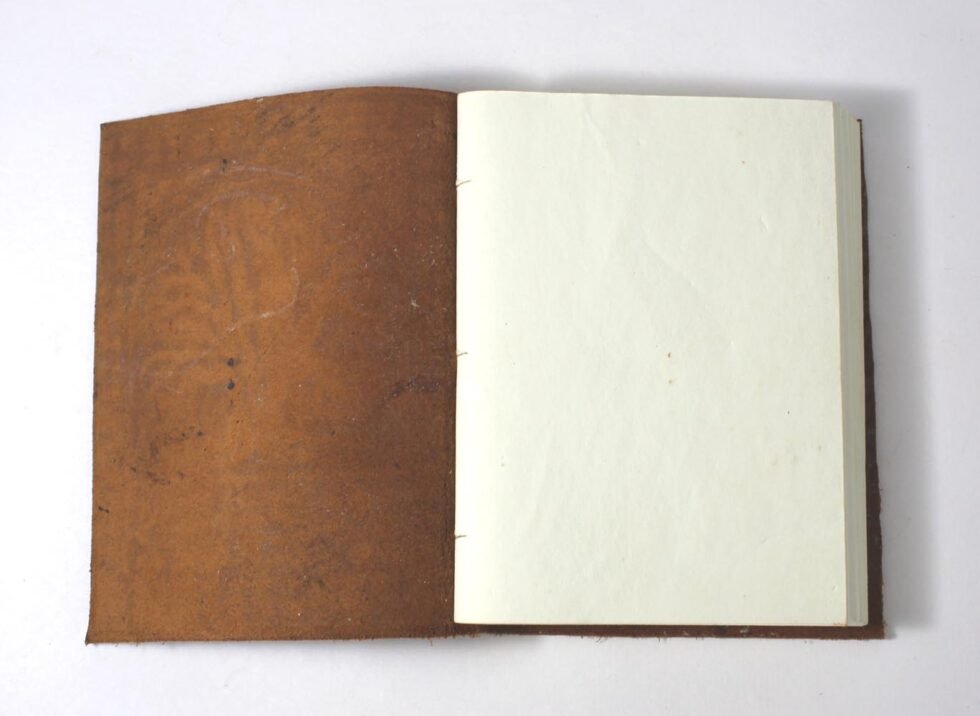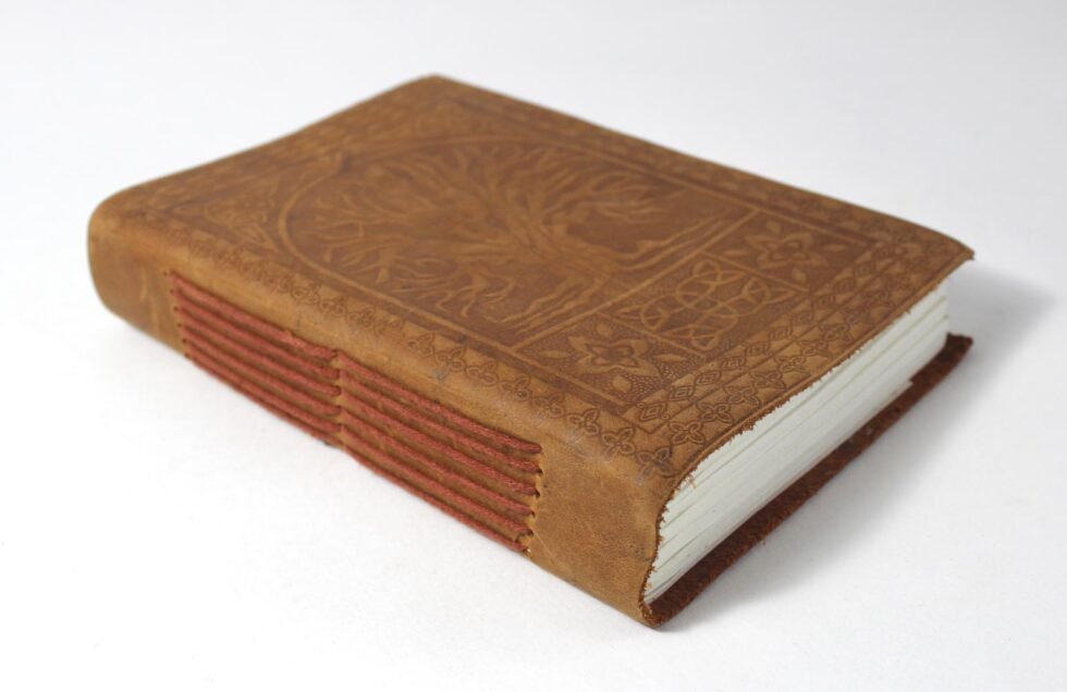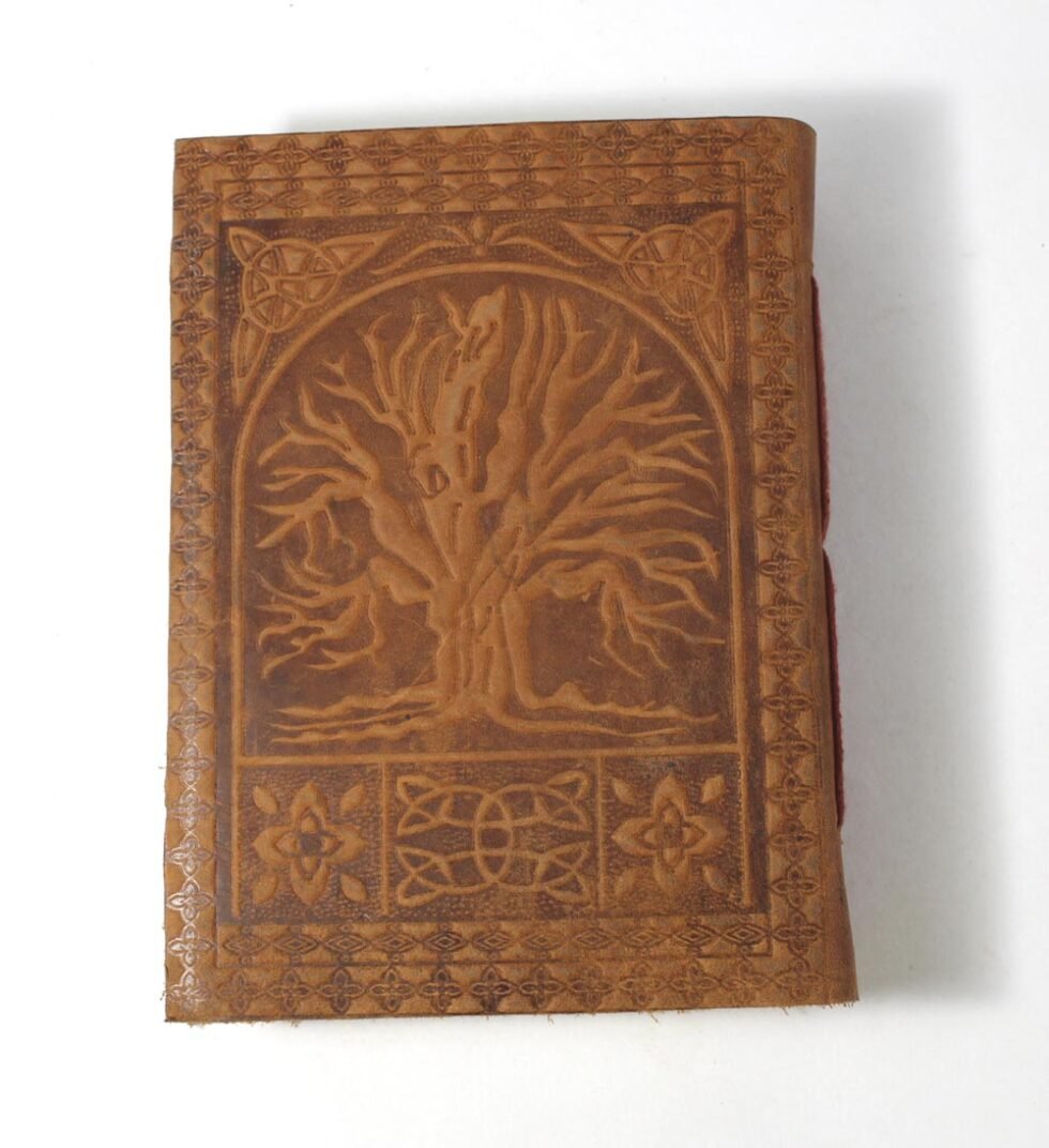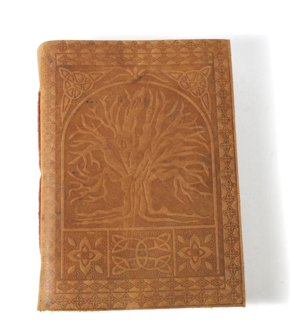 Crunch buffalo leather. Thick, rich, softer and antique looking leather gives a very special finish to this gypsy style travel journal. Tree of Life is embossed on the front & back covers. Inside is the 120 sheets / 240 pages of recycled cotton handmade papers which is wood free, acid free and does not bleed with ink pen.