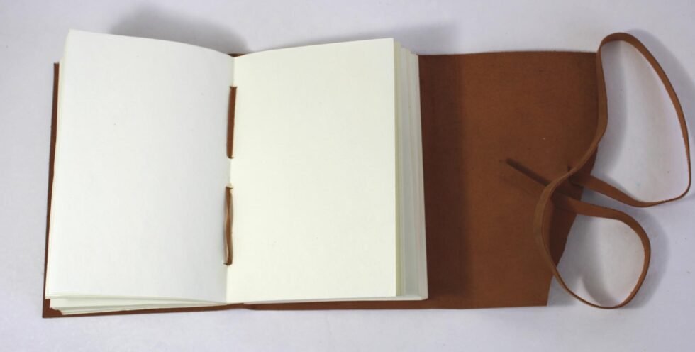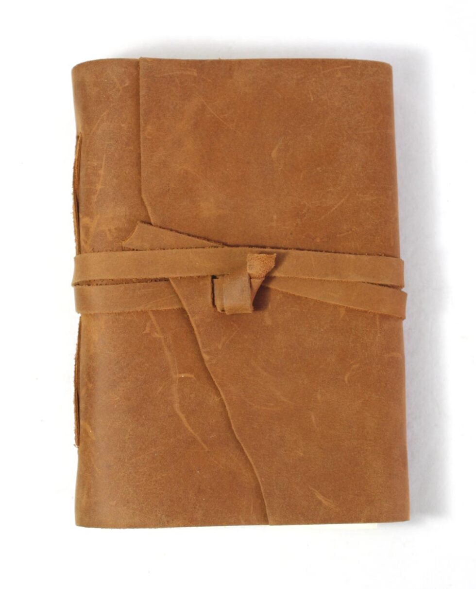 Oil crunch buffalo leather. Thick, rich, softer and antique looking leather gives a very special finish to this gypsy style travel journal. Leather string is used for hand binding, giving it a very special ethnic touch. Inside is the 100 sheets / 200 pages of handmade recycled cotton papers which is wood free, acid free and does not bleed with ink pen.