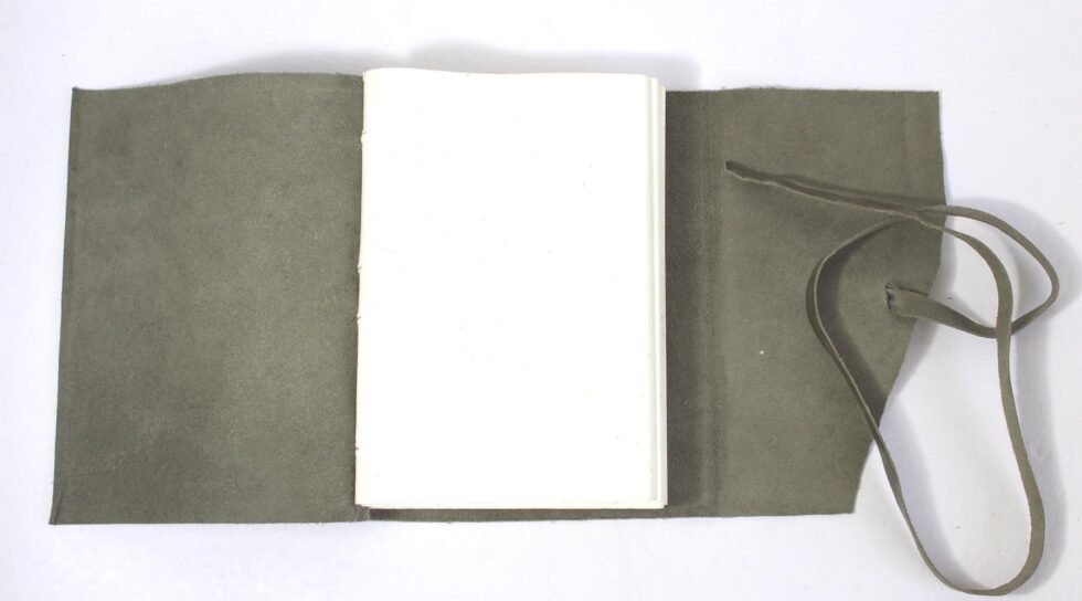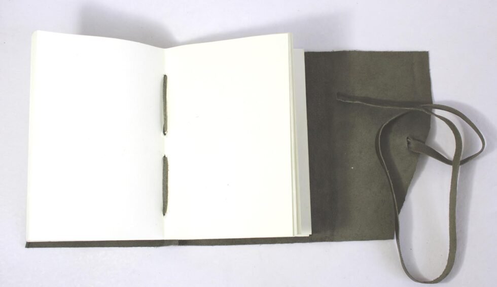 Oil crunch buffalo leather. Thick, rich, softer and antique looking leather gives a very special finish to this gypsy style travel journal. Leather string is used for hand binding, giving it a very special ethnic touch. Inside is the 100 sheets / 200 pages of recycled cotton handmade papers which is wood free, acid free and does not bleed with ink pen.