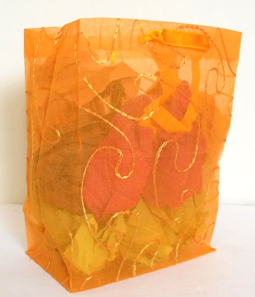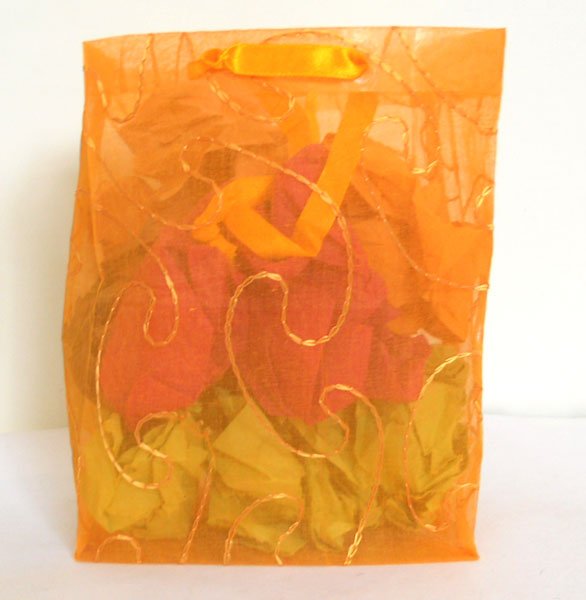 Fine quality transparent organza fabric 100% cotton in orange color with matching embroidery all over. Supported by poly acetate collars & bottom to make it sturdy and for better use!