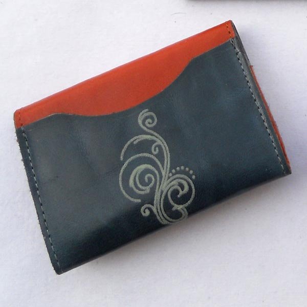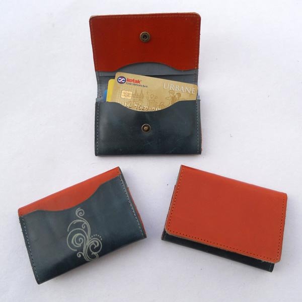Credit card holder with a flap. Two colors – orange & dull faded green. Fine quality of cream color print at the back on green color