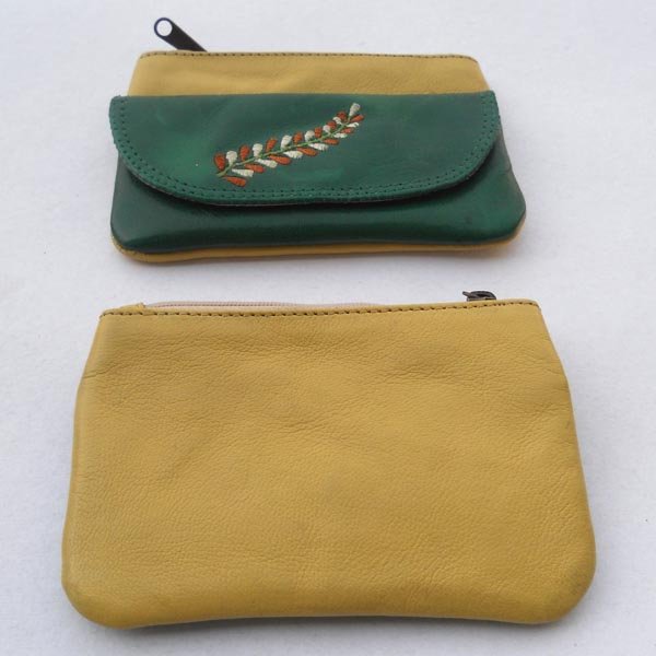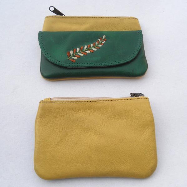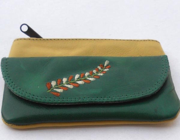 Pale yellow leather with green leather front having a beautiful embroidery.