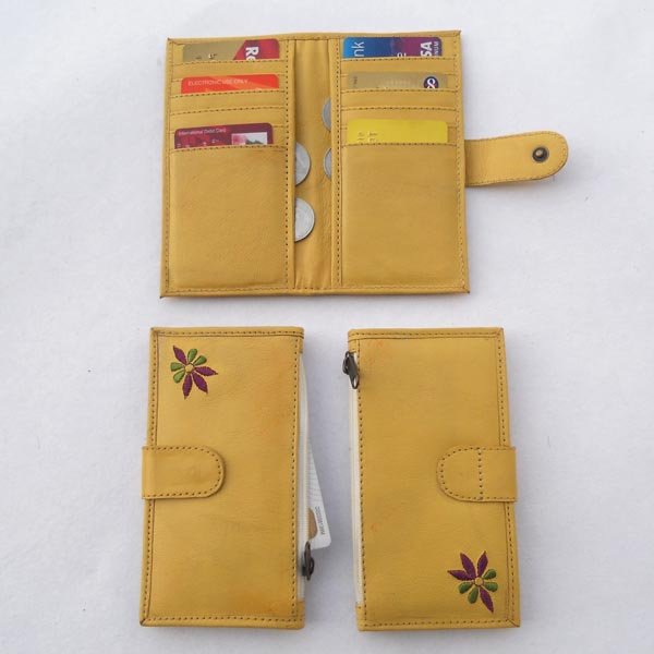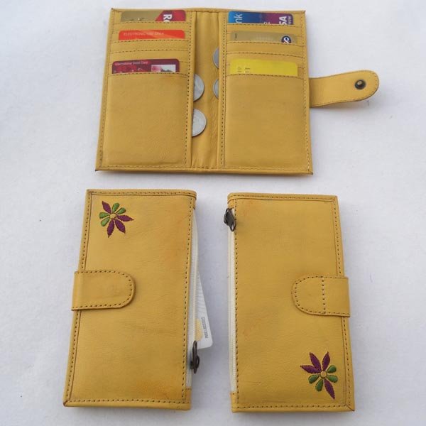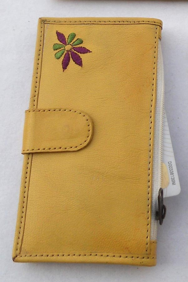 Pale yellow leather with multiple pockets for credit cards & two large side pockets for coins / documents. Fine embroidery work forming a flower at the corners.