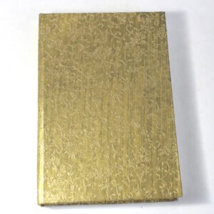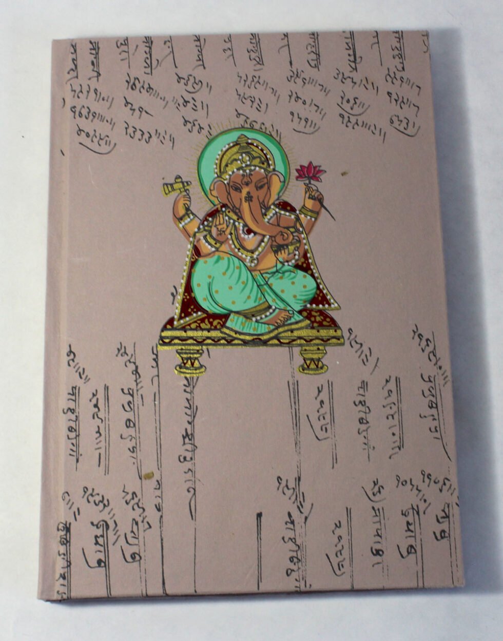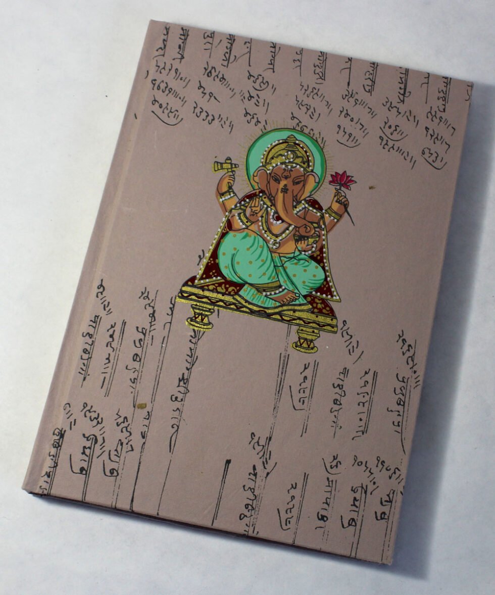 Antique looking A4 notebook with old ‘Bahi-Khata’ scripts running all over on recycled cotton handmade paper’s cover. On the front cover, Ganesh – Gord of Wealth & Wisdom is printed in multi-colour. It is silver screen hand print. At the back, auspicious elephant too is printed. A beautiful aesthetically made symbolic Dewali Present, and very auspicious too, for someone you wish very special! Just inside both the covers, front and back, there is another thick cream colour wood free / acid free paper sheet layer, holding the inside writing pages gracefully. In the middle, 48 sheets / 96 pages for smooth writing which never bleed with the ink or in calligraphy and can be a lovely travel book / art and craft book or a book – keeping domestic accounts and other valuable notes & details.