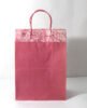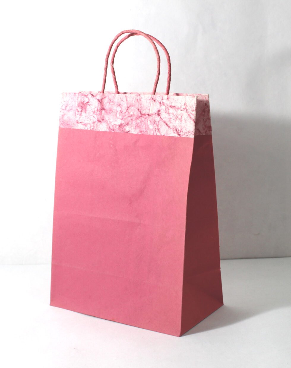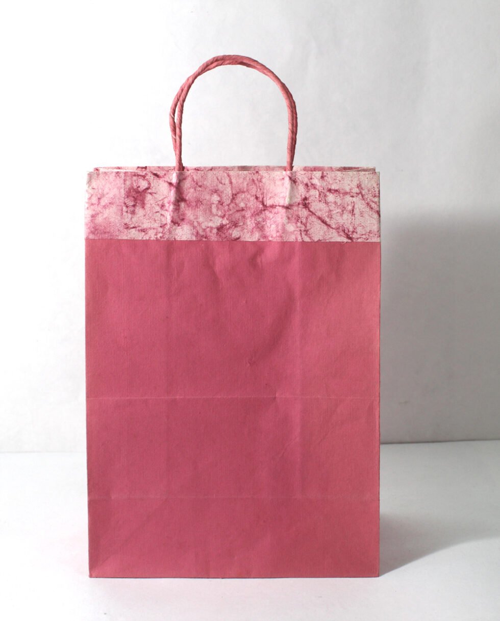 Recycled cotton handmade paper given batik print all over the top, while plain matching paper underneath. Handles are matching paper cords. To strengthen up the collars and bottom, separate card sheets inside those are given.