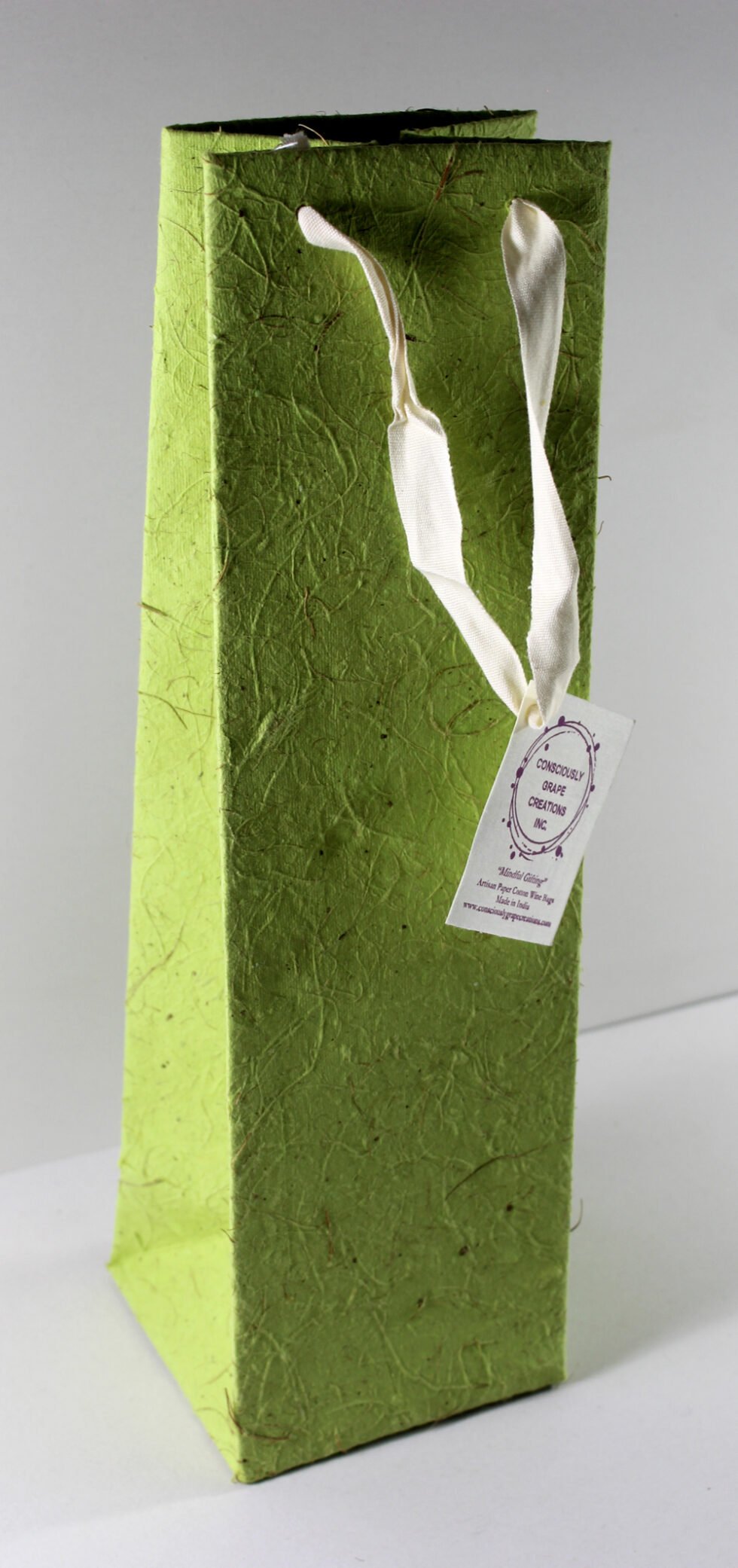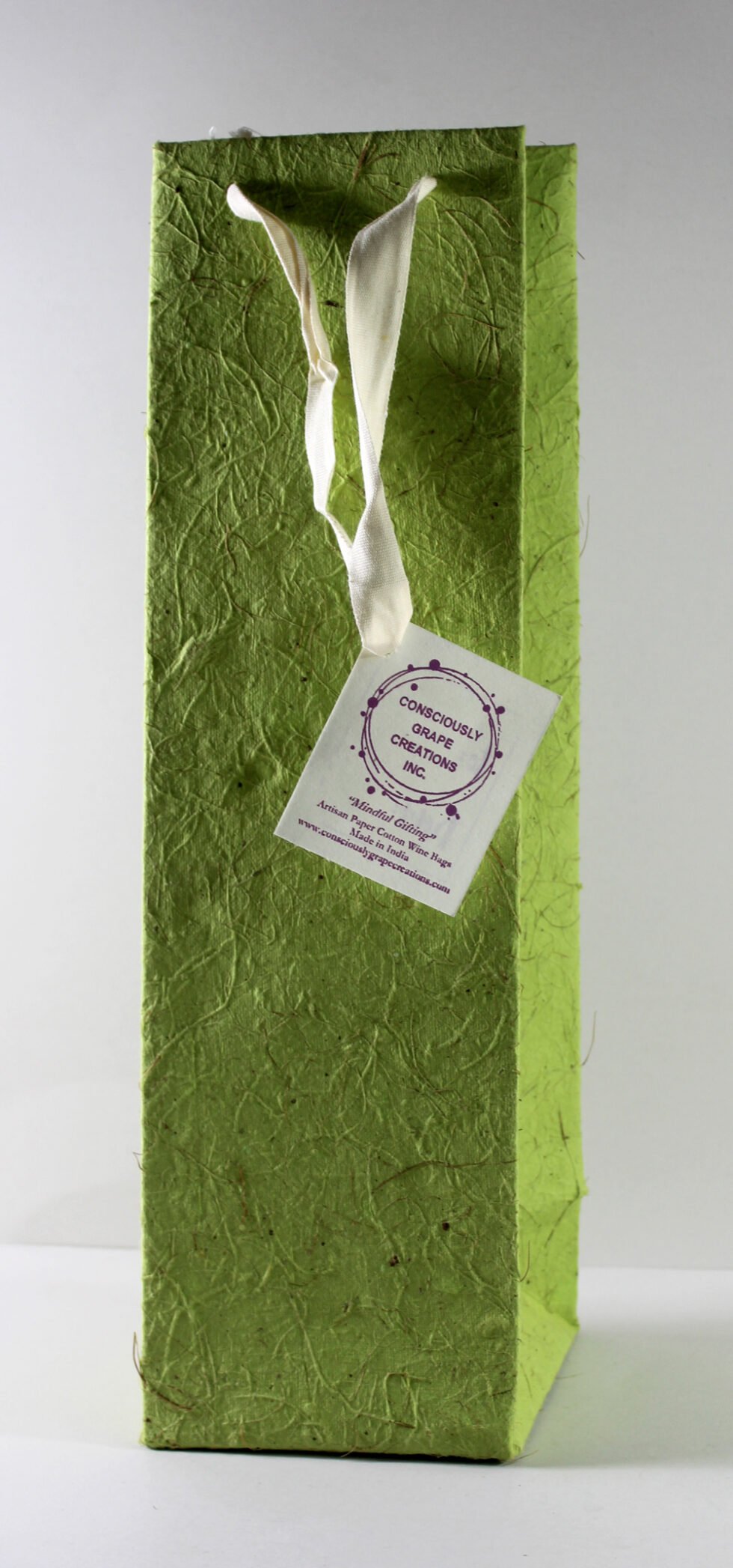 A lovely premium wine bag for exclusive use! Thick recycled cotton & coconut fiber handmade paper. Matching / contrasting cotton ribbon handles are given with matching gift tag. Further, bottom and collars of the bags are strengthened up by providing card sheets inside.