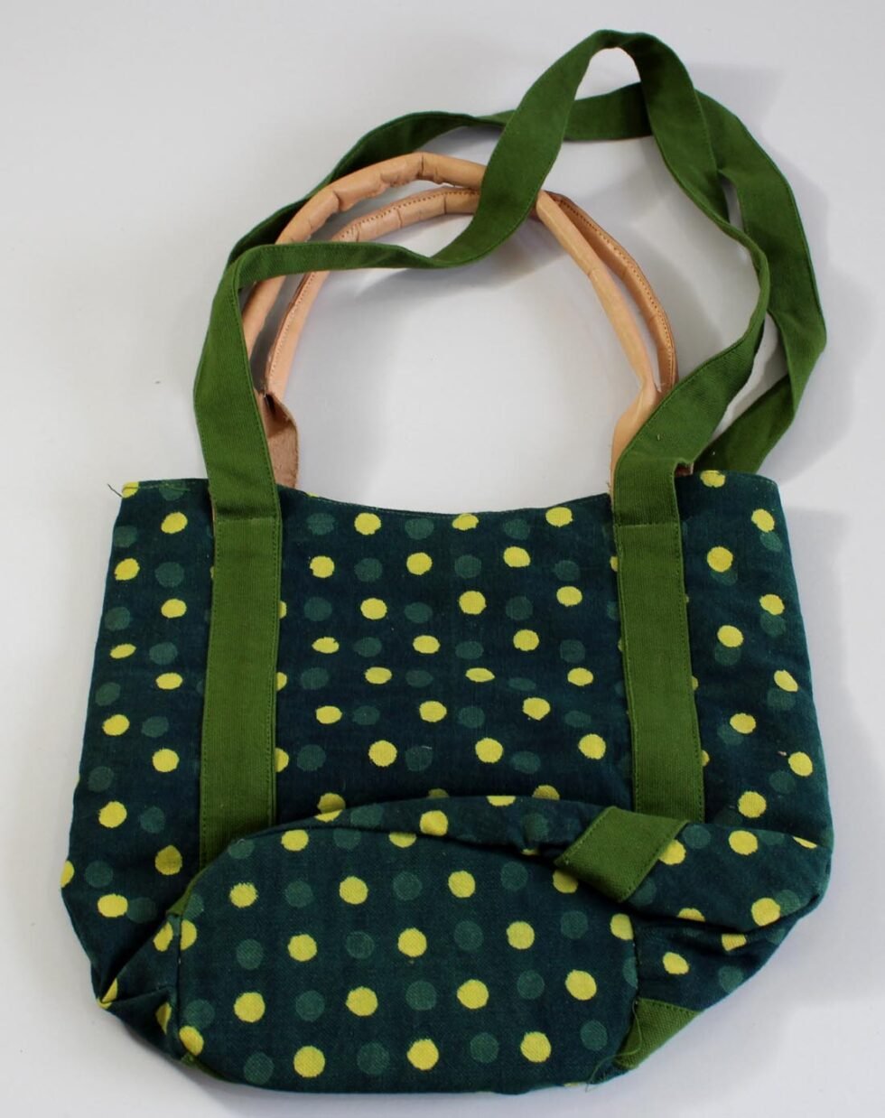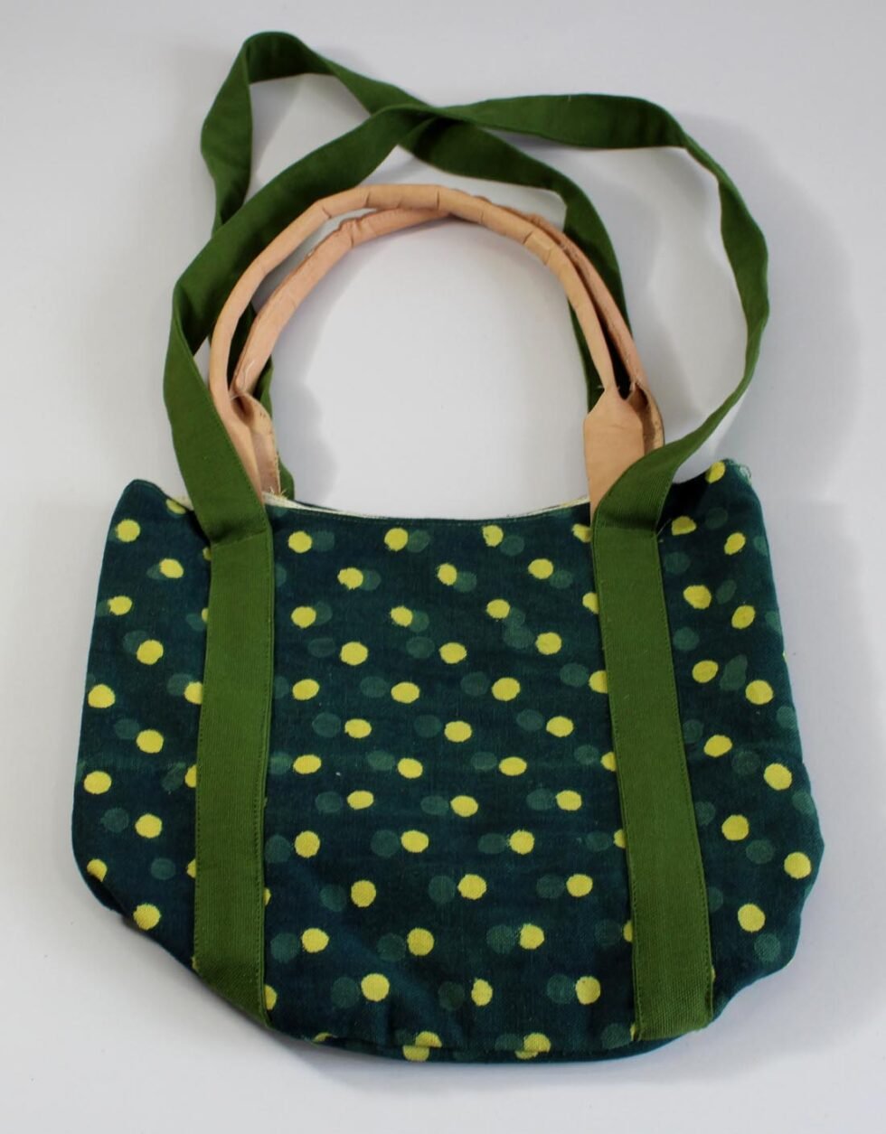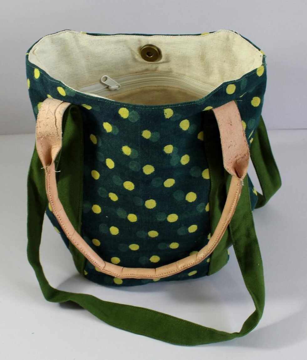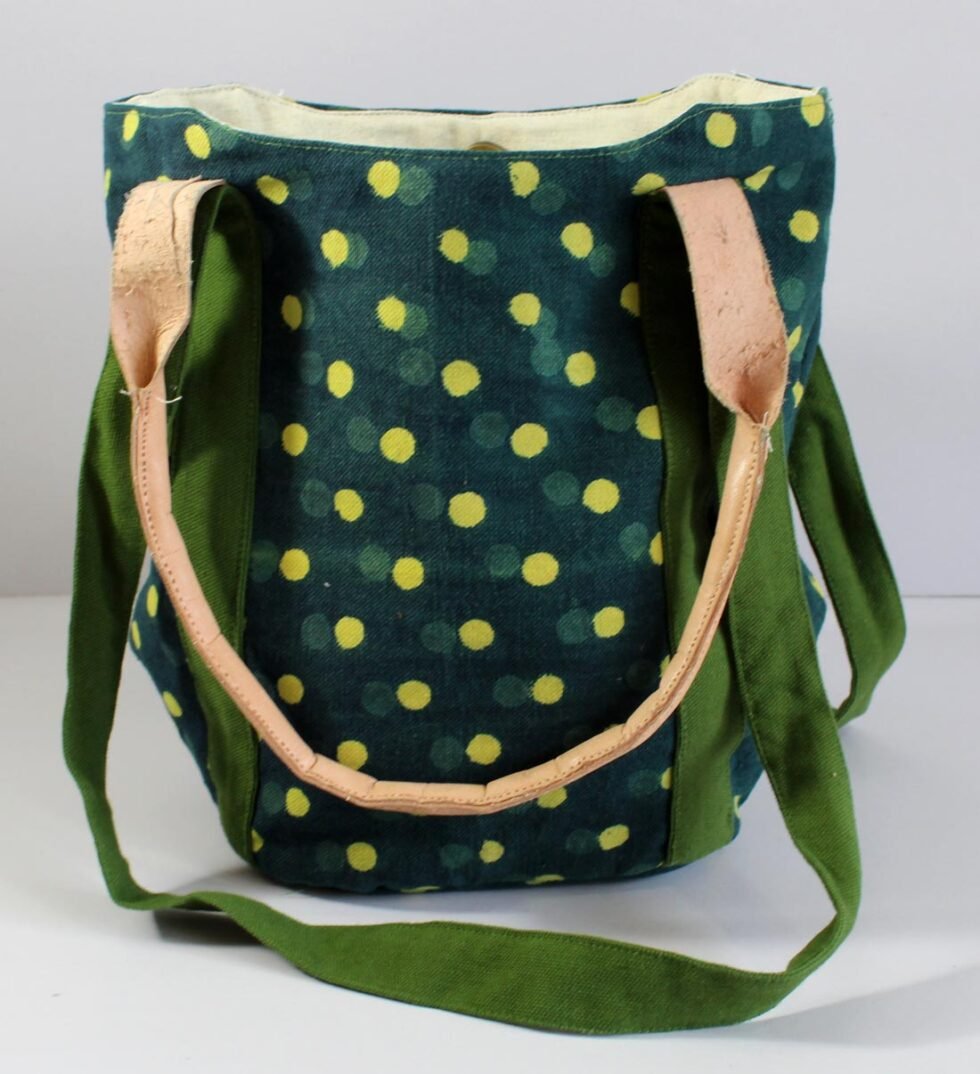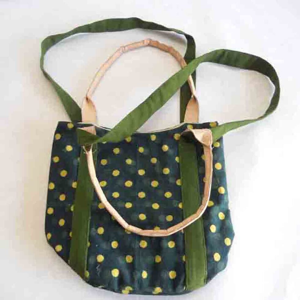 Screen printed canvas bag with leather being selectively used at places. Fancy but sturdy shopping bag. Can be used as cotton fabric handbag too! A truly ethnic touch, coming from the cottage industry artisans of Rajasthan, India.
