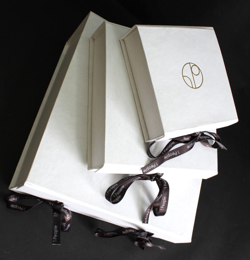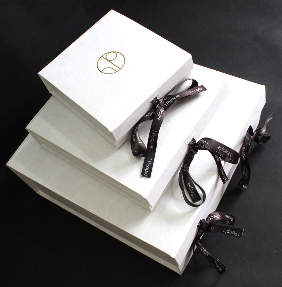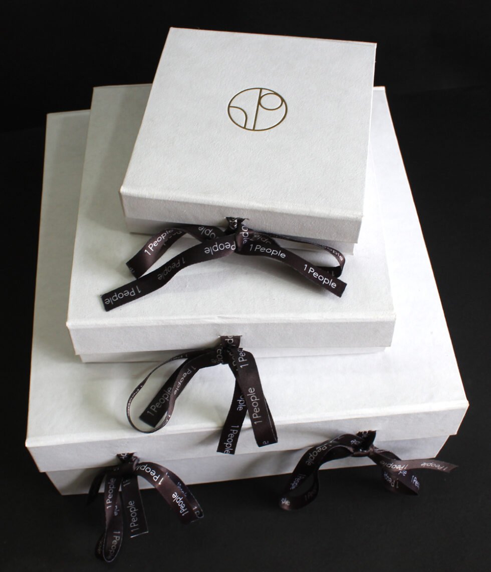 Solid collapsible boxes made of sturdy cardboard / white handmade paper of recycled cotton / black customised branded printed satin ribbon. On the lid of the box, there is heat stamped foil printed logo. Inside is ink printed description about the garment to be packed. Inside bottom bears debossed logo. A wonderful eco friendly way of packaging your products in a safe way. Being collapsible box – lots of saving in transportation & storage!