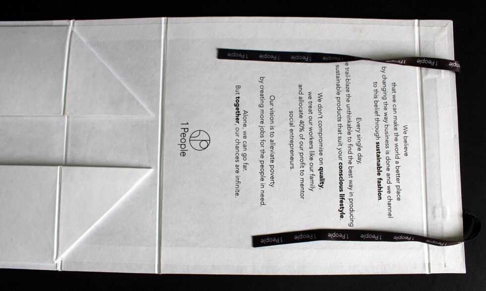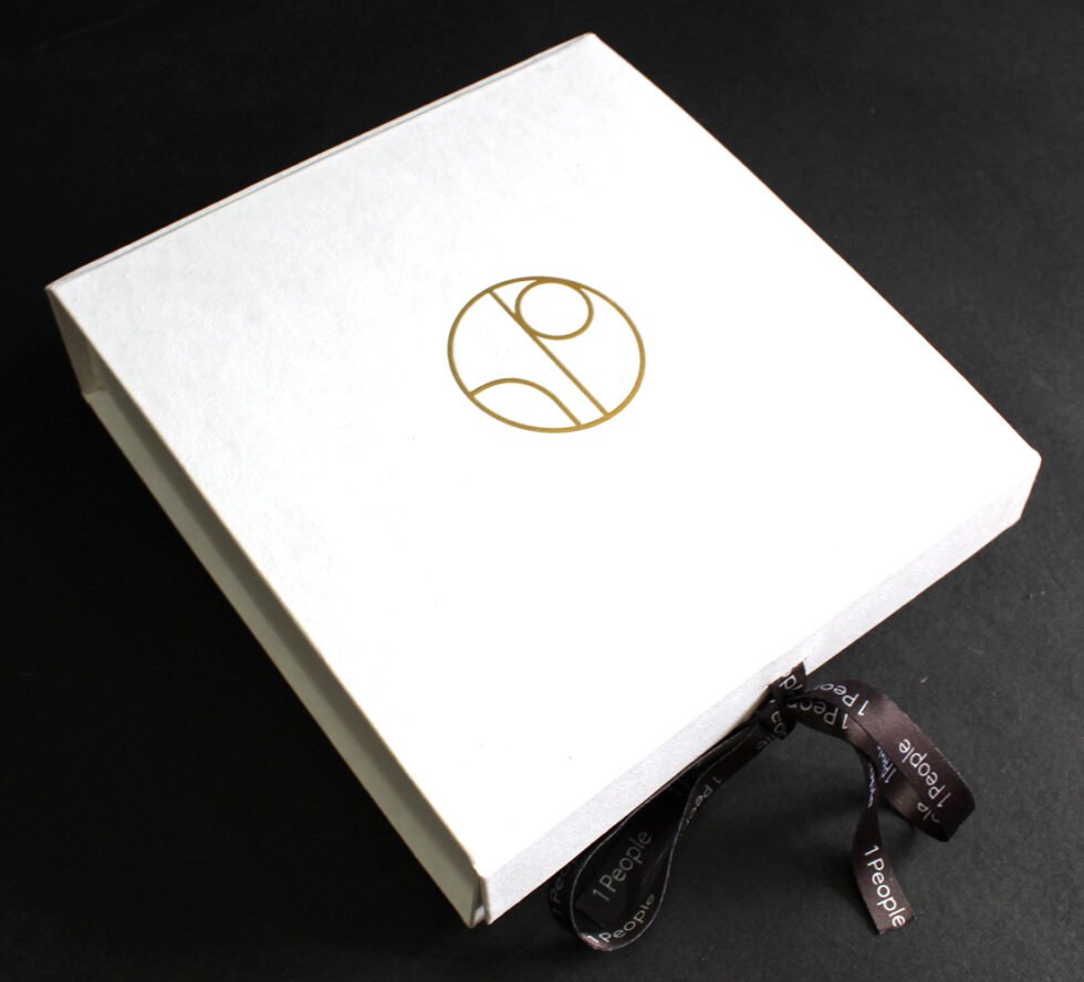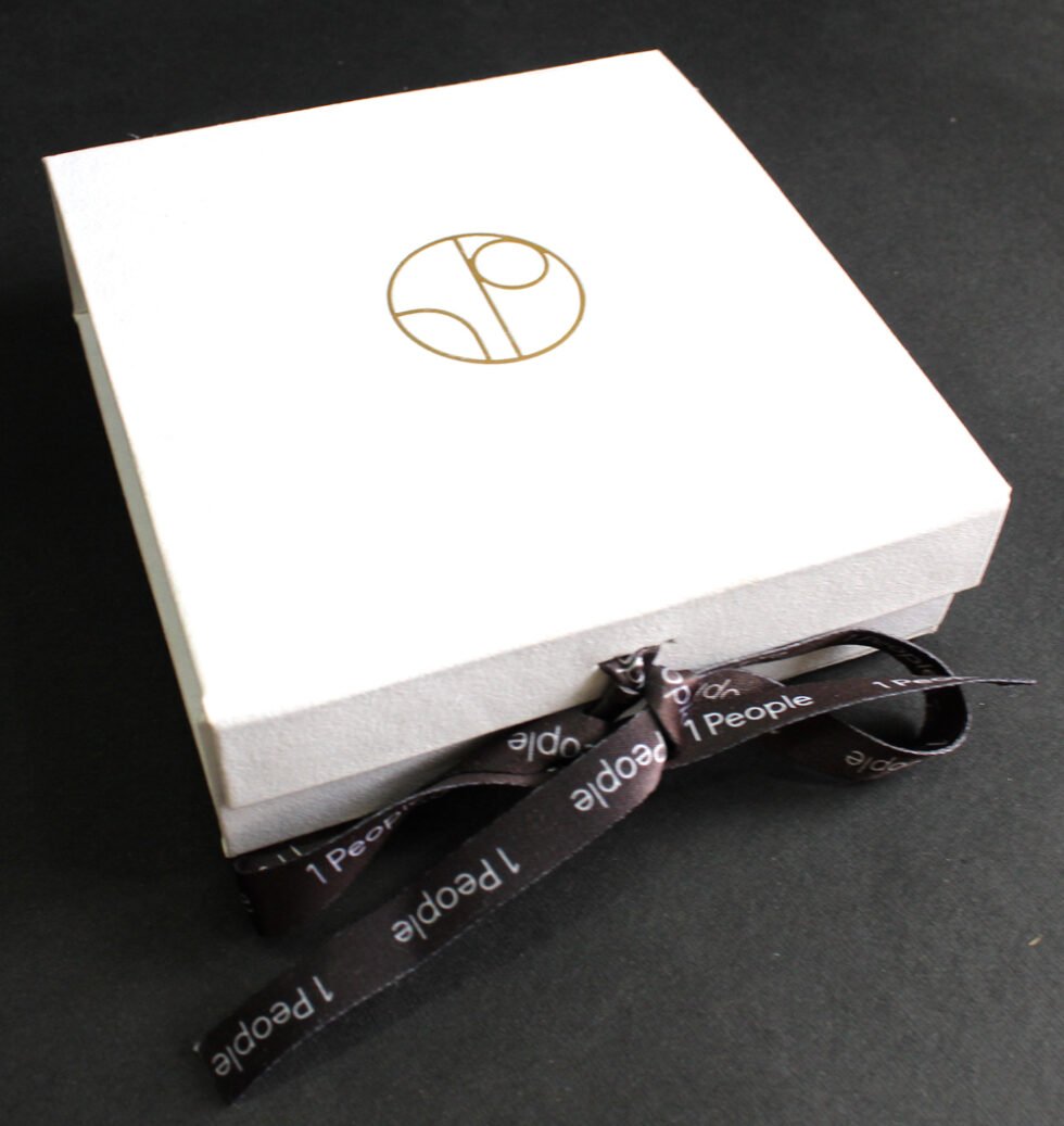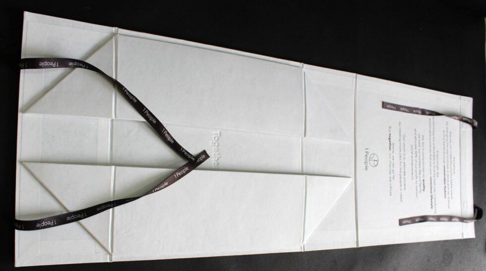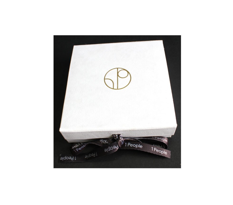 Solid collapsible boxes made of sturdy cardboard / white handmade paper of recycled cotton / black customised branded printed satin ribbon. On the lid of the box, there is heat stamped foil printed logo. Inside is ink printed description about the garment to be packed. Inside bottom bears debossed logo. A wonderful eco friendly way of packaging your products in a safe way. Being collapsible box – lots of saving in transportation & storage!