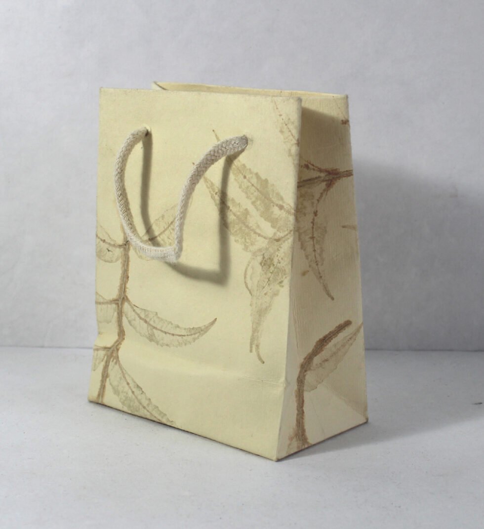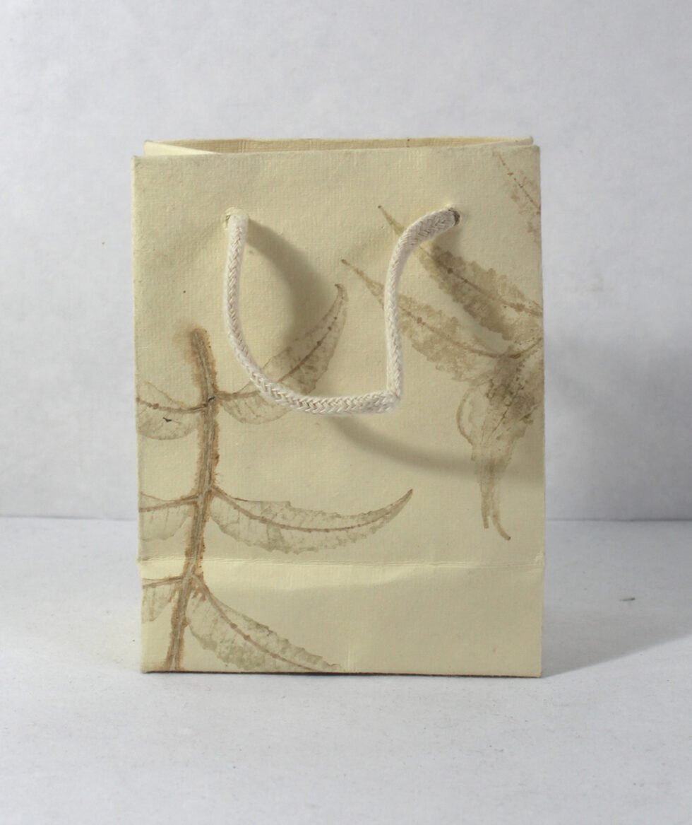 A beautiful ‘Green Life Style Product’ with natural elegance. Thick recycled cotton handmade paper with the fresh green leaves impressions all around the paper. Matching cotton string handles are provided. To strengthen the collars and bottom of the bag, card sheets are placed insde.