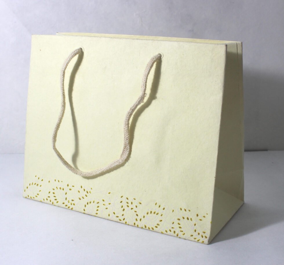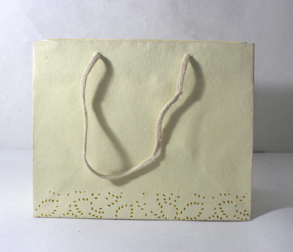 Recycled cotton handmade paper given glitter print all over the bottom, while plain matching paper above that. Handles are matching cotton strings. To strengthen up the collars and bottom, separate card sheets inside those are given.