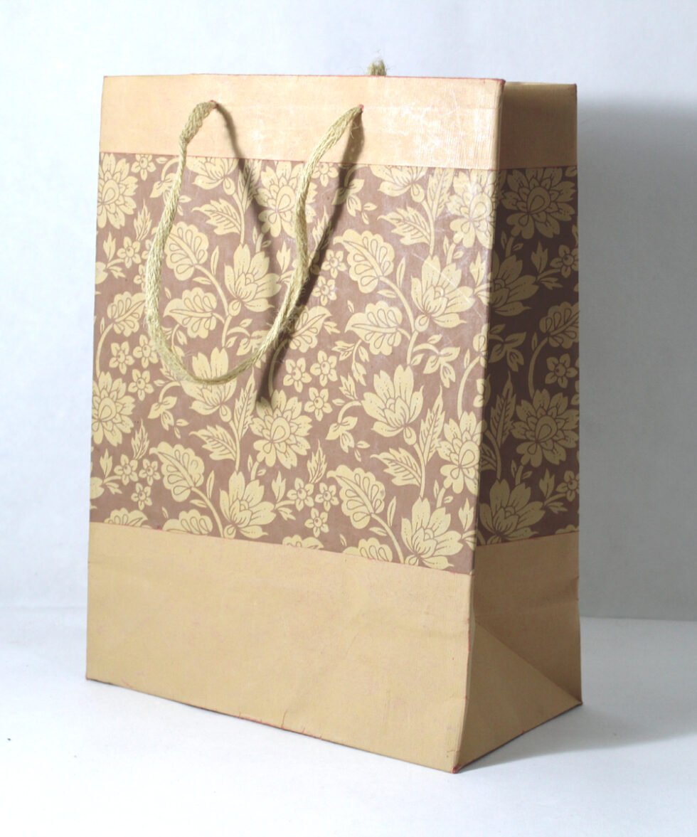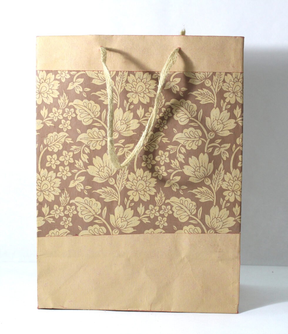 Recycled cotton handmade paper with ink print all around it, while matching plain paper at the bottom and top of it. Matching cotton string as handles. Collars and bottom of the bags are further strengthened by providing card sheets over there in a concealed way.