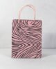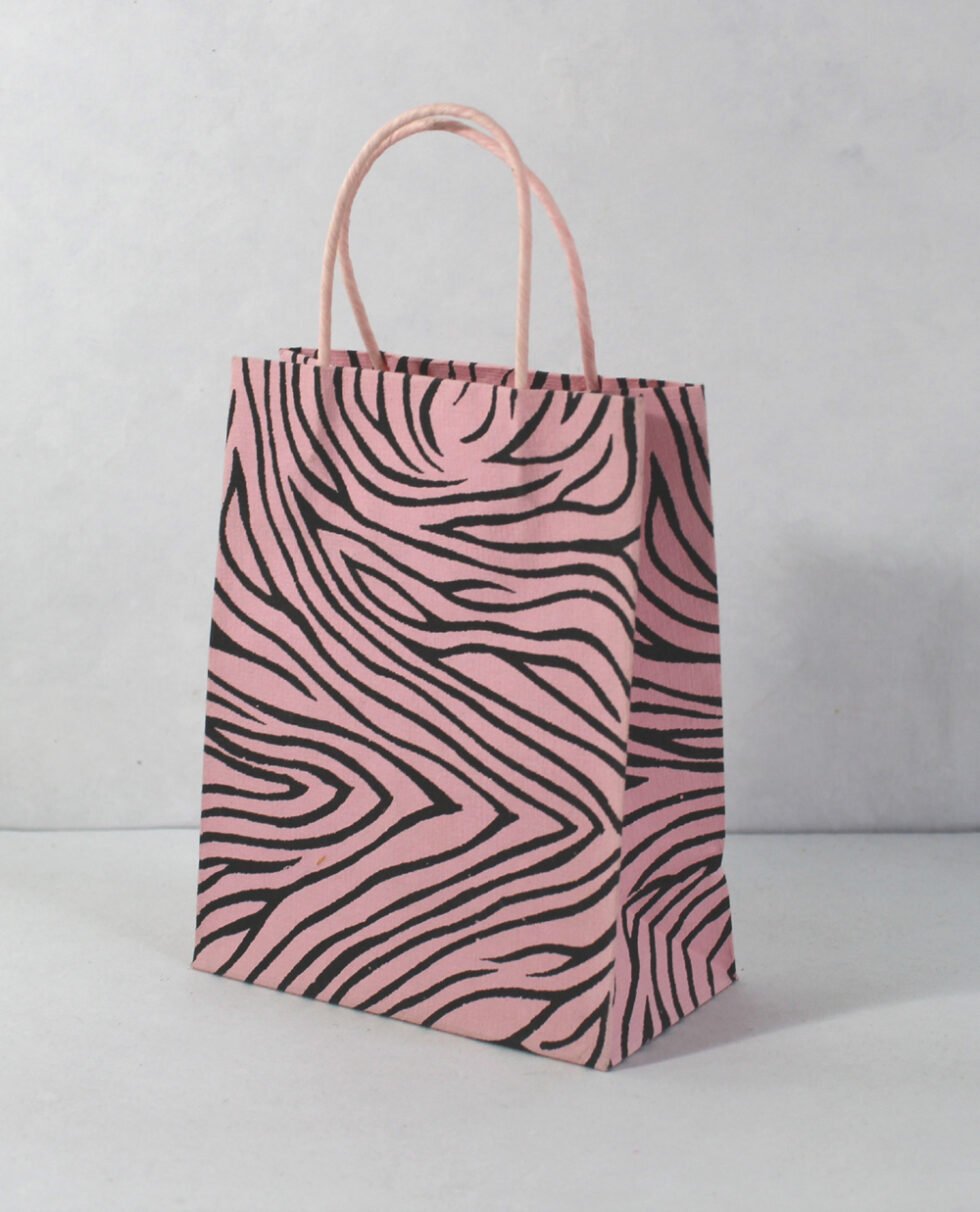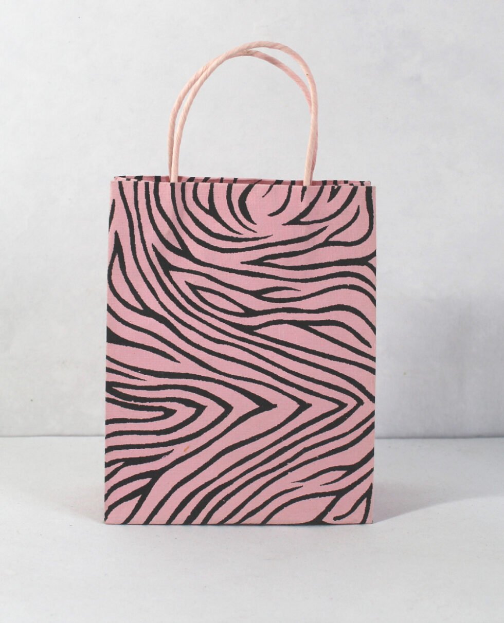 Recycled cotton handmade paper with ink print all around it. Matching paper cord as handles. Collars and bottom of the bags are further strengthened by providing card sheets over there in a concealed way.