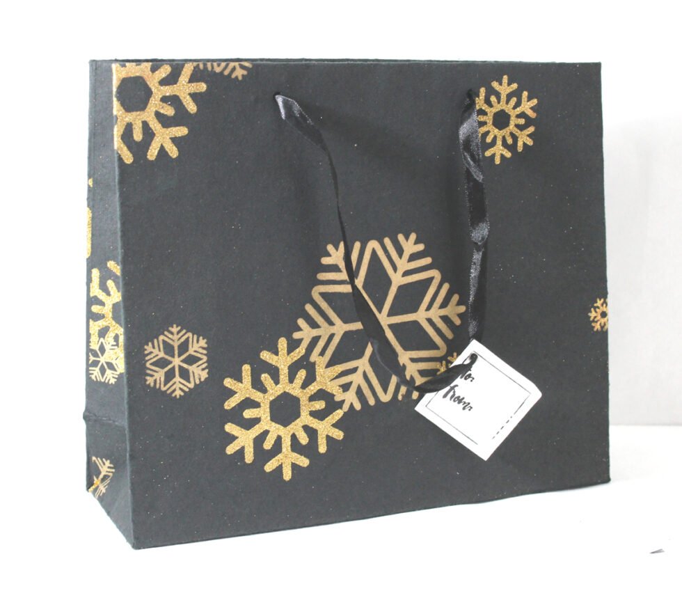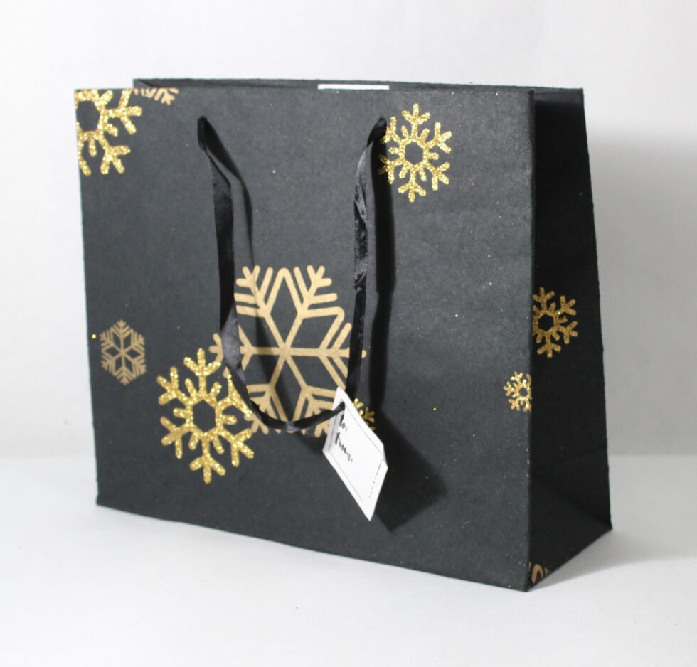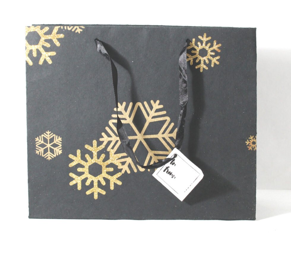 A lovely premium gift bag for exclusive use! Thick recycled cotton handmade paper with metallic golden and golden glitter print all around. Matching satin ribbon handles are given with matching gift tag. Further, bottom and collars of the bags are strengthened up by providing card sheets inside.