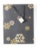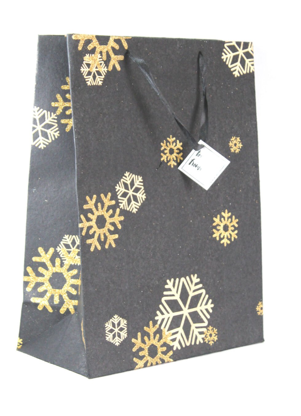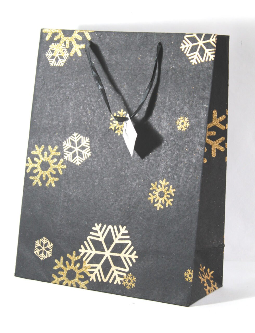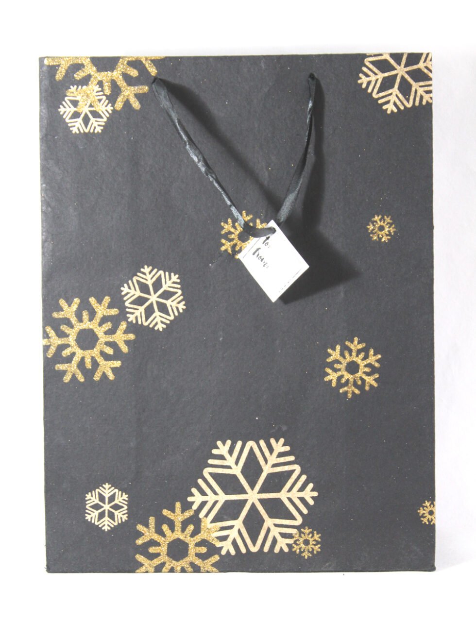 A lovely premium gift bag for exclusive use! Thick recycled cotton handmade paper with metallic golden and golden glitter print all around. Matching satin ribbon handles are given with matching gift tag. Further, bottom and collars of the bags are strengthened up by providing card sheets inside.
