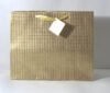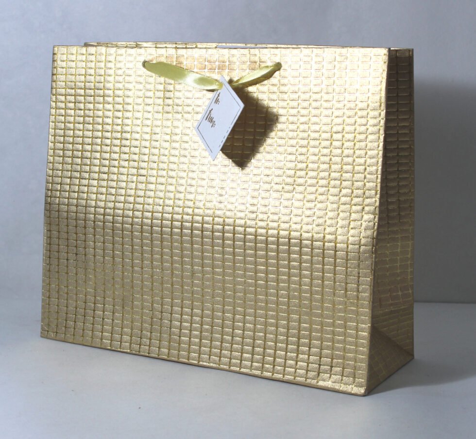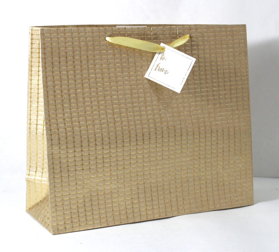 A lovely premium gift bag for exclusive use! Thick recycled cotton handmade paper with metallic golden base all around. Later on embossed and foil printed too all around in the forms of small checks. Matching satin ribbon handles are given with matching gift tag. Further, bottom and collars of the bags are strengthened up by providing card sheets inside.