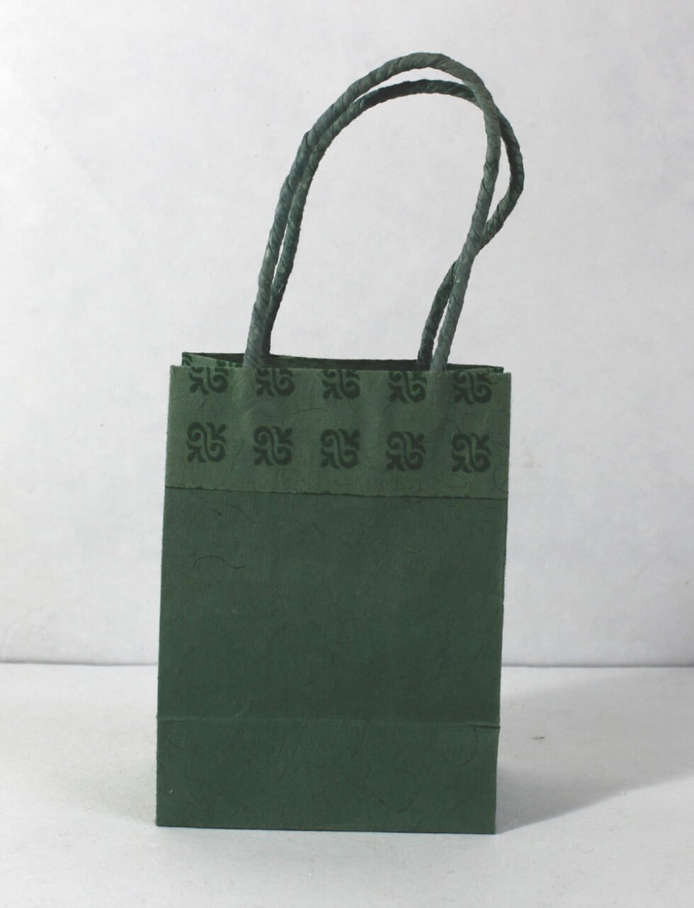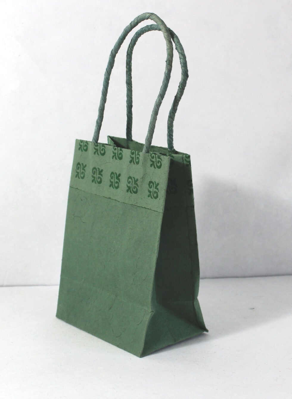 Recycled handmade cotton paper bag with matching paper cord handle. Fine quality of flock print (velvet print) in floral design is given around it…in matching or contrasting colour.