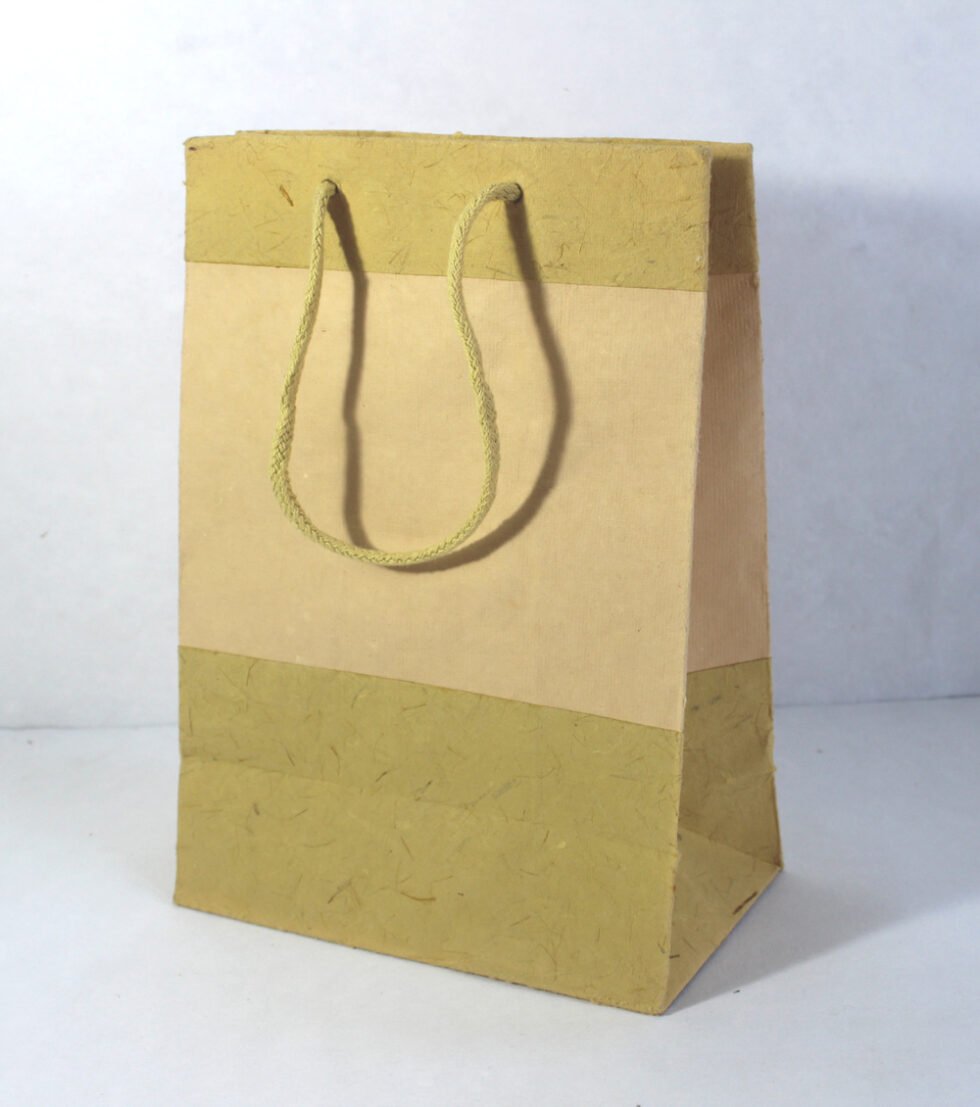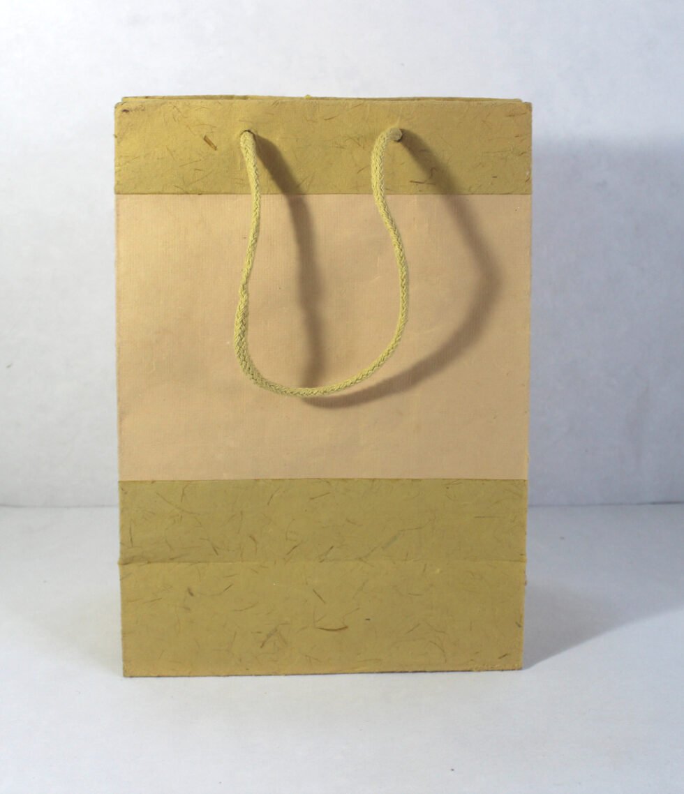 Recycled handmade cotton paper with some ‘tone to tone’ contrast colours. Matching cotton string handles are provided. To strengthen collars and bottom further, separate card sheets are placed inside those.