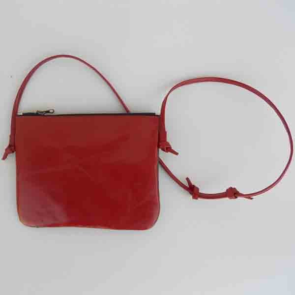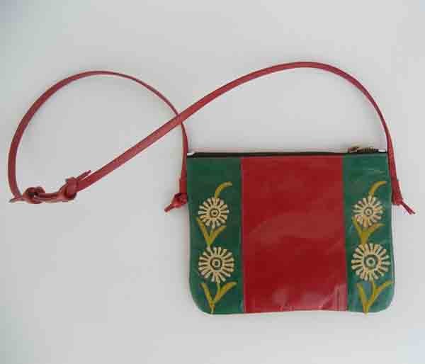 Red & green color leather. Red handle and green embroidered stripes only at front .