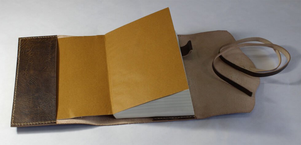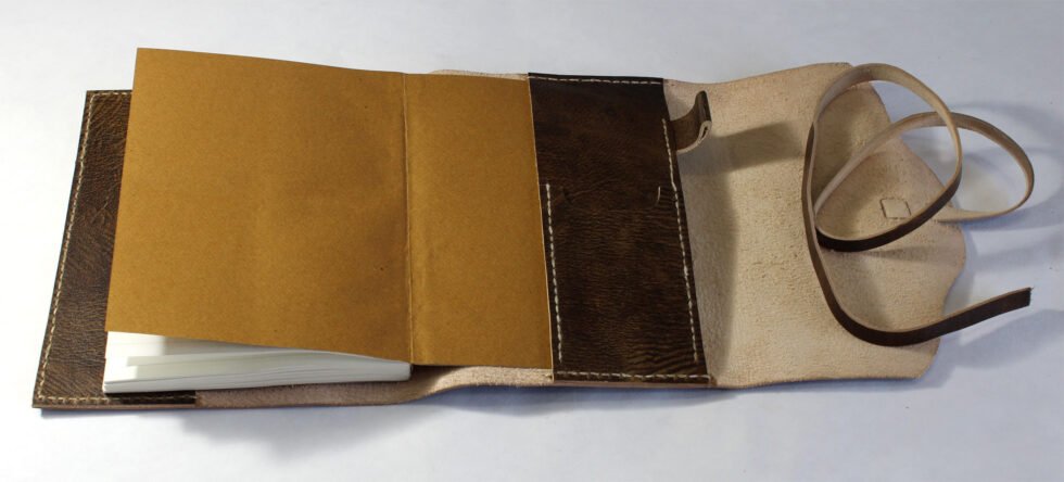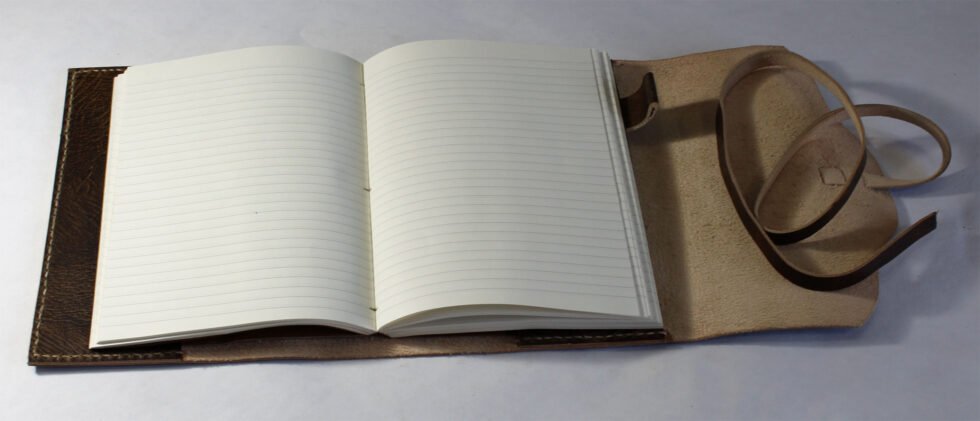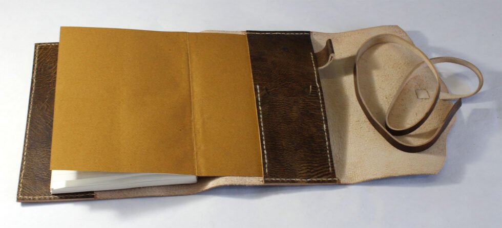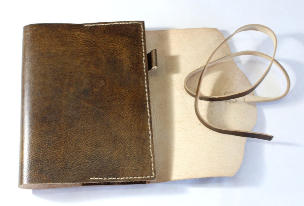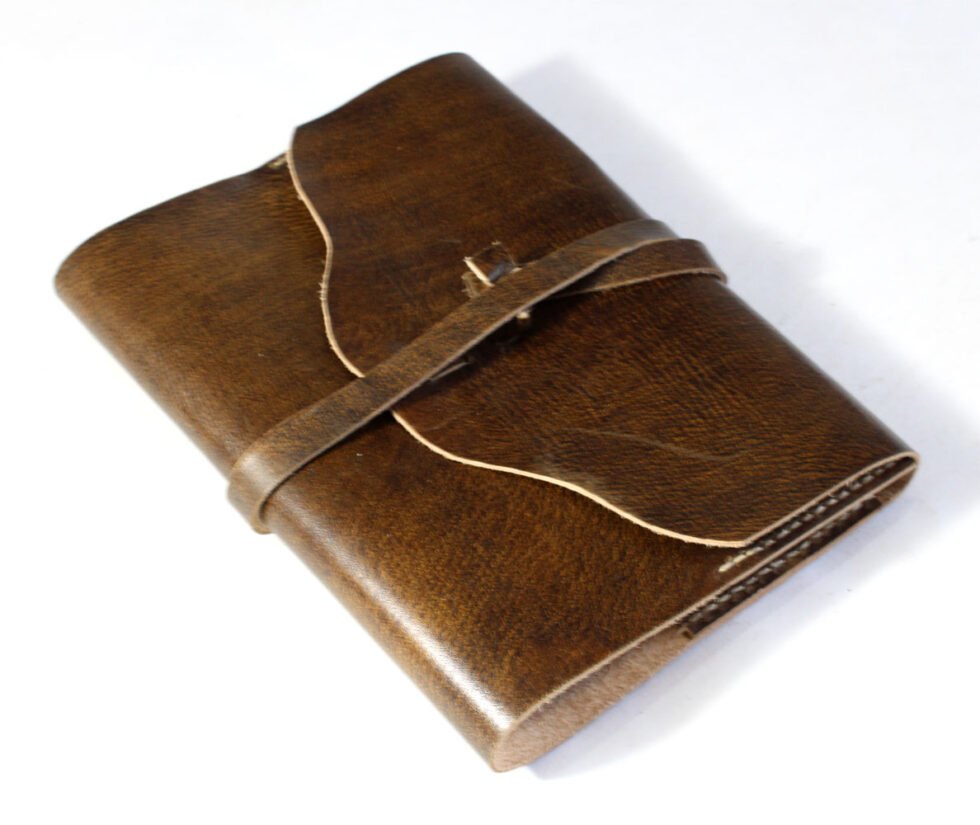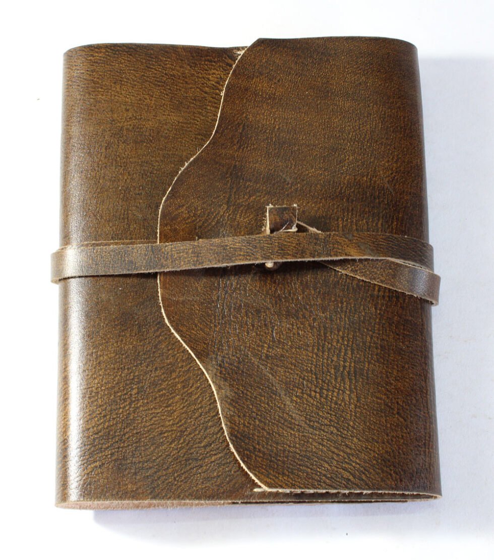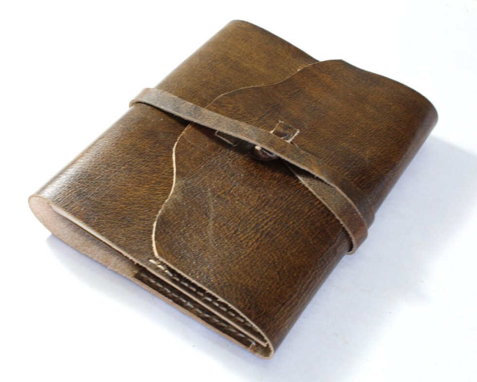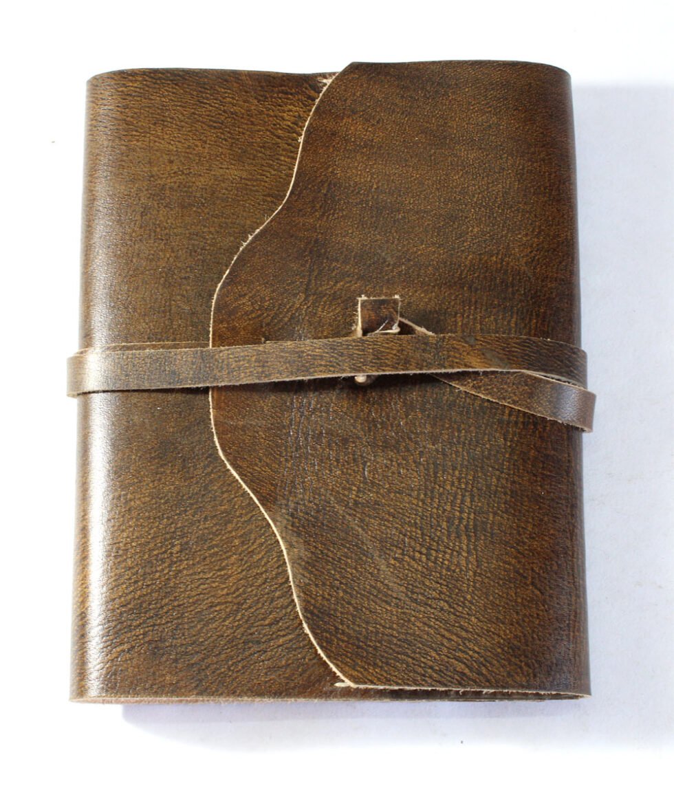 Refillable goat TC leather journal in antique brown with a vintage look. Includes 72 sheets (144 pages) of replaceable lined paper.