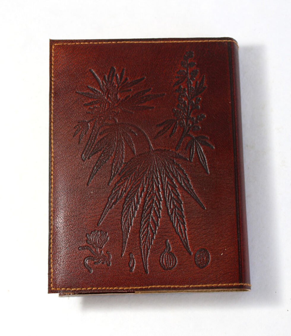 Hand bound goat leather journal in dull cherry colour. Hand crafted journal with different species of jute and hemp leaves embossed on the front leather cover. Inside are 100 sheets / 200 pages of ‘Jute Paper’ in natural shade of 70 GSM. Excellent paper to write upon which never bleeds with ink or even in painting! Truely recycled paper, handmade paper, wood free paper – with Ph level 7 or higher – its an acid free paper too! A truly green life style product and a timeless present for boys, girls, corporates and more!