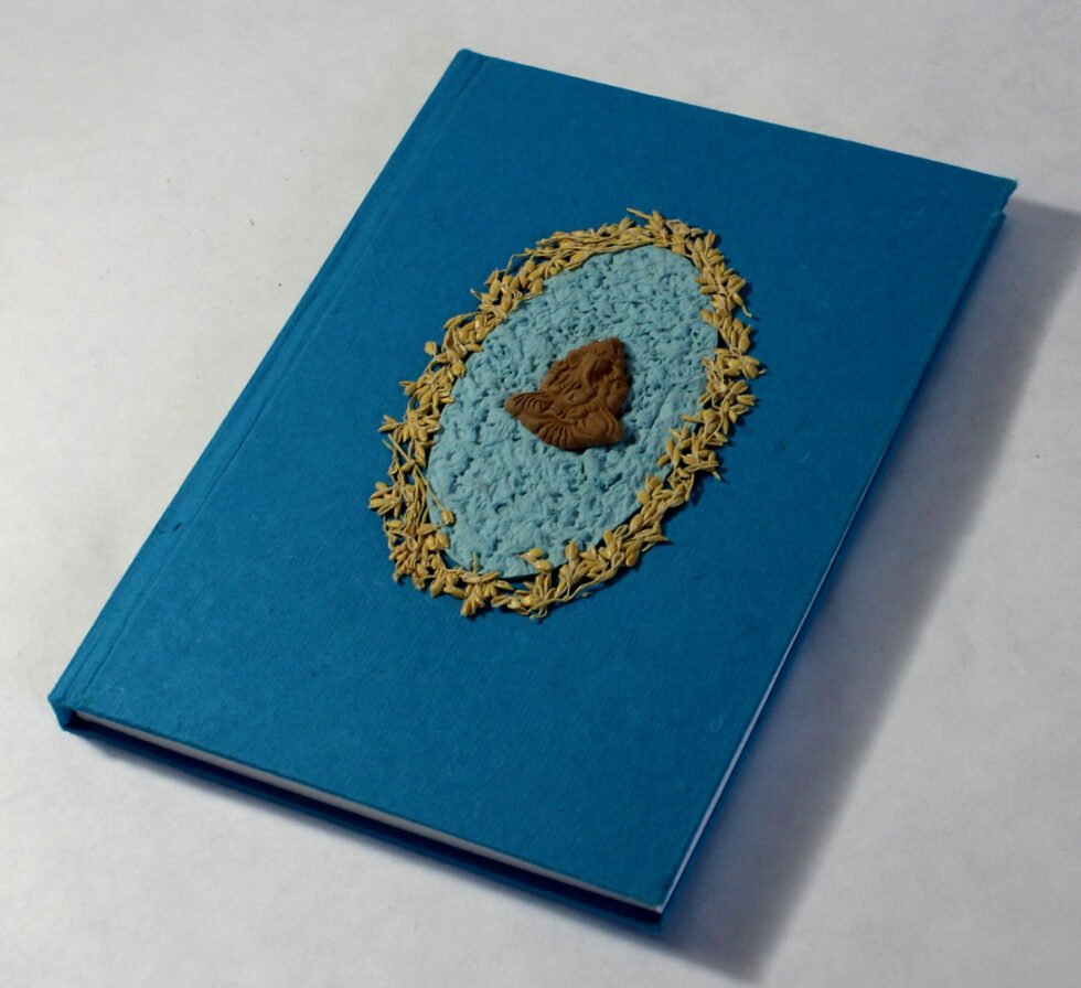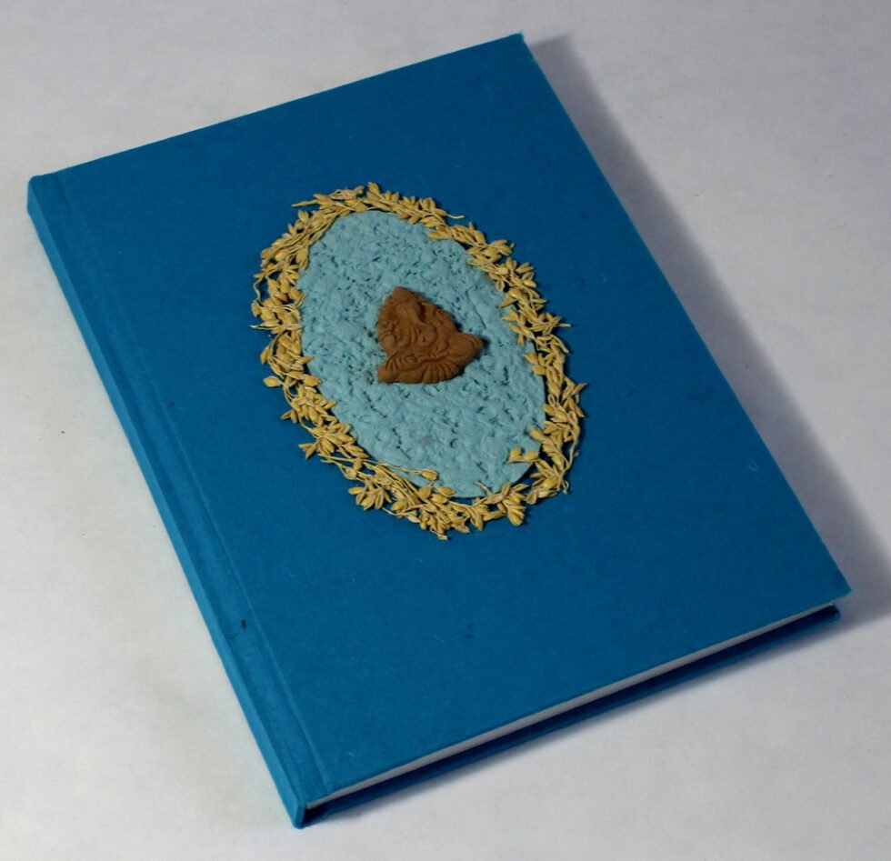 Beautiful collage design by gluing down a special paper in oval shape known as ‘Moon Rock’ on the front cover of the notebook. Further surrounded by the auspicious white grass around its border. In the centre, Lord Ganesh – The God of wisdom & Wealth, is placed, making it a very unique Diwali Present! A beautiful aesthetically made symbolic Diwali Present, and very auspicious too, for someone you wish very special! Just inside both the covers, front and back, there is another thick cream colour wood free / acid free paper sheet layer, holding the inside writing pages gracefully. In the middle, 48 sheets / 96 pages for smooth writing which never bleed with the ink or in calligraphy and can be a lovely travel book / art and craft book or a book – keeping domestic accounts and other valuable notes & details.