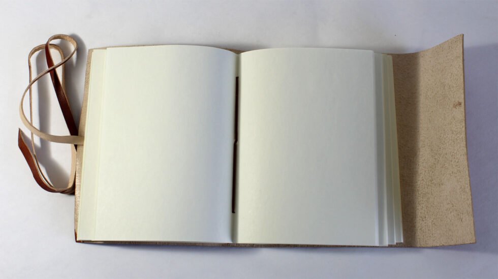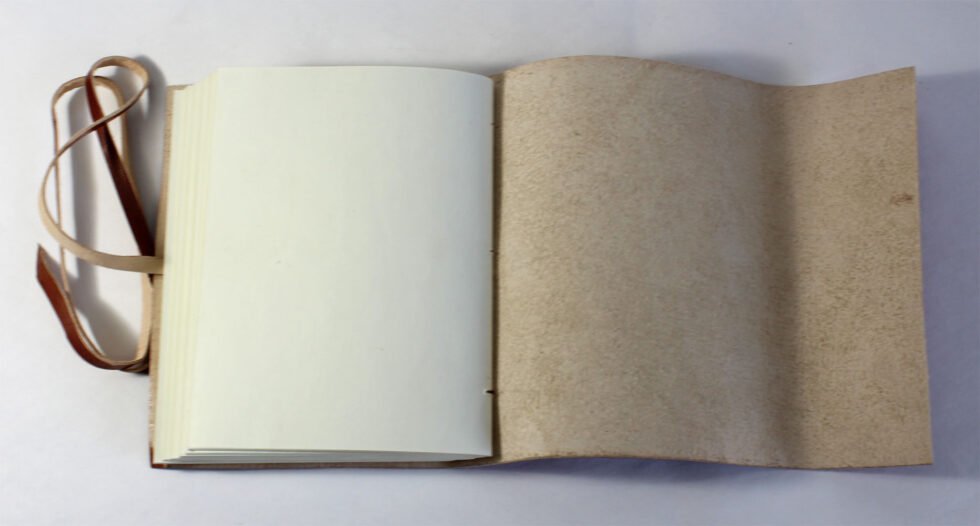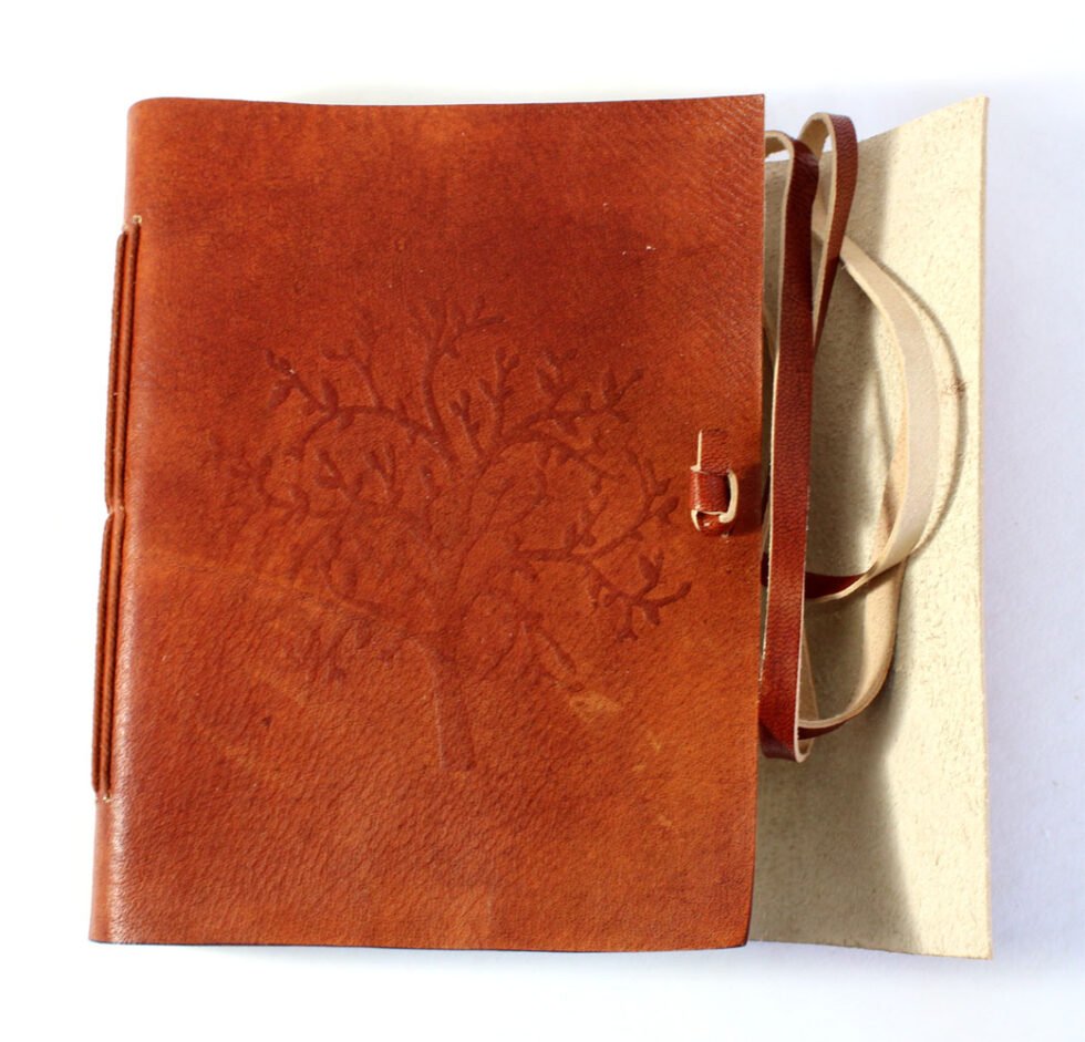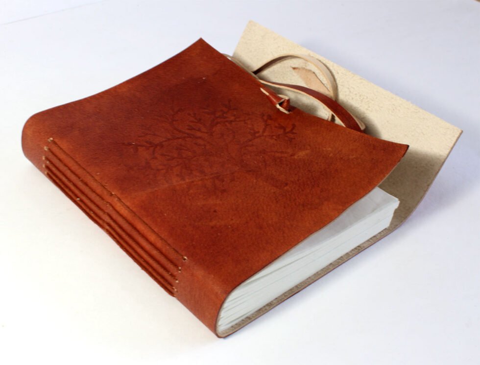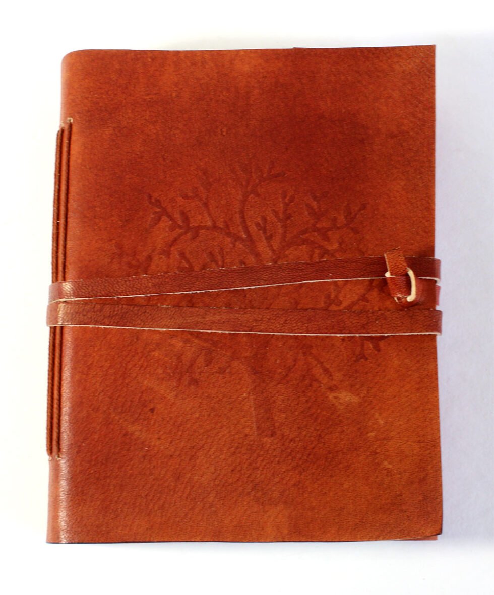 Rust color genuine leather bound journal with goat TC. Front is having embossed tree design and a flap of around 2″ is provided on the other side of the journal for a perfect closure with the help of same color leather strap. Inside are 120 sheets / 240 pages of recycled cotton paper – handmade. A perfect green life style present with gypsy and rugged look in vintage style.