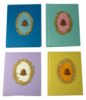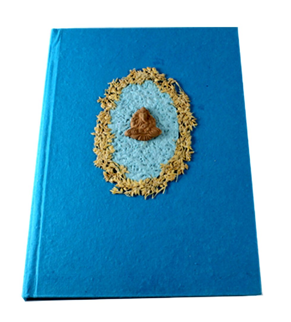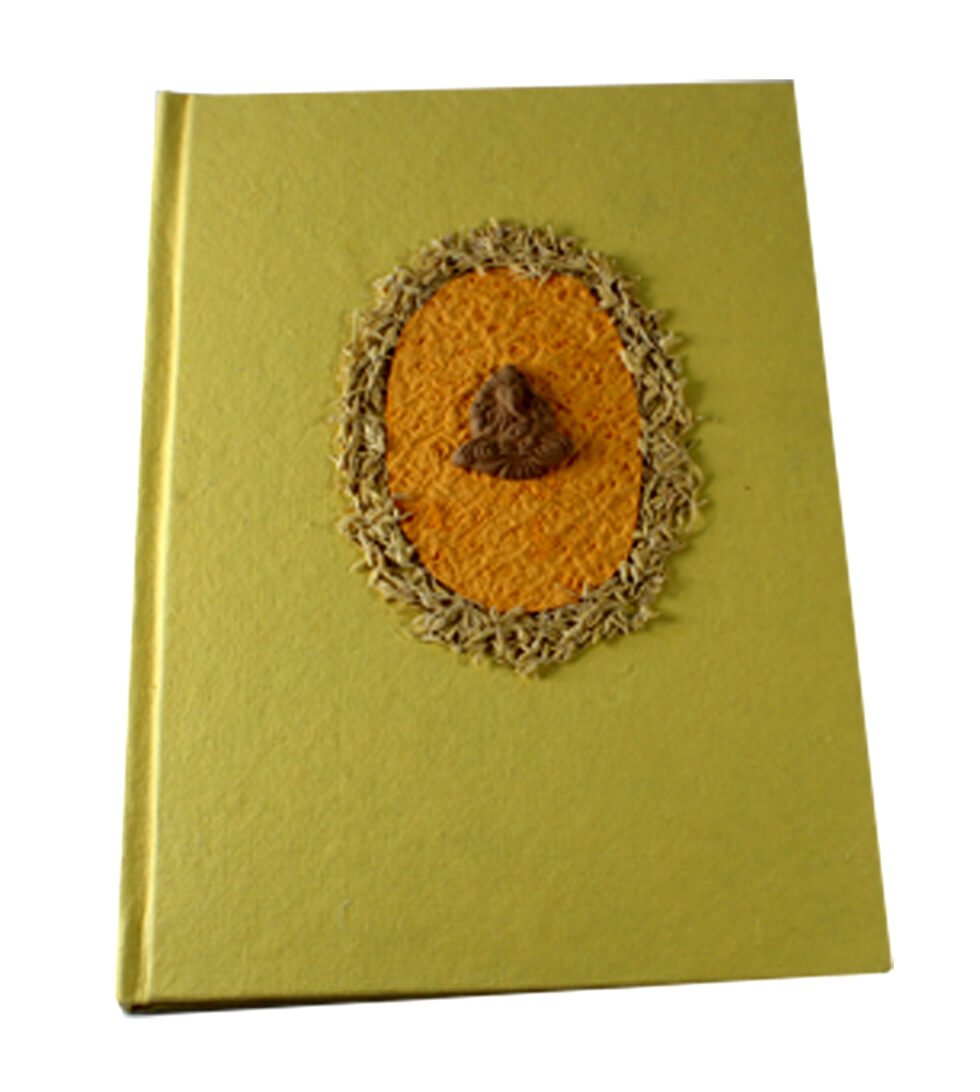 Set of 4 pcs beautiful collage design by gluing down a special paper in oval shape known as ‘Moon Rock’ on the front cover of the notebook. Further surrounded by the auspicious white grass around its border. In the centre, Lord Ganesh – The God of wisdom & Wealth, is placed, making it a very unique Diwali Present! A beautiful aesthetically made symbolic Diwali Present, and very auspicious too, for someone you wish very special! Just inside both the covers, front and back, there is another thick cream colour wood free / acid free paper sheet layer, holding the inside writing pages gracefully. In the middle, 48 sheets / 96 pages for smooth writing which never bleed with the ink or in calligraphy and can be a lovely travel book / art and craft book or a book – keeping domestic accounts and other valuable notes & details.
