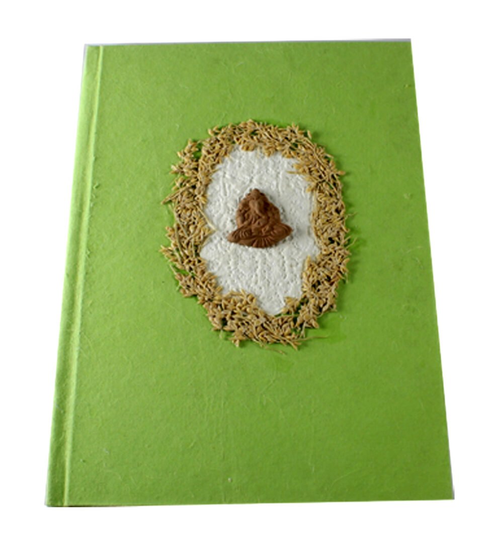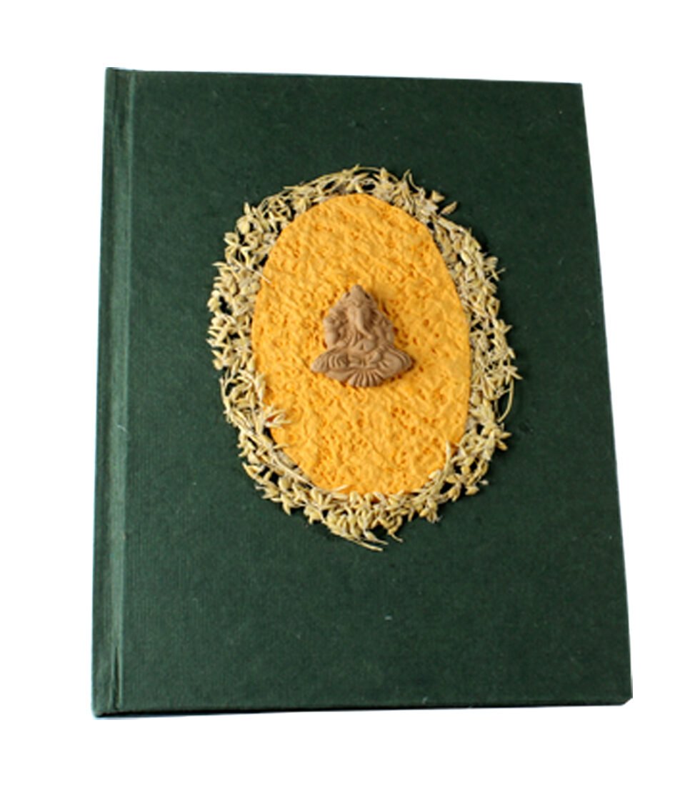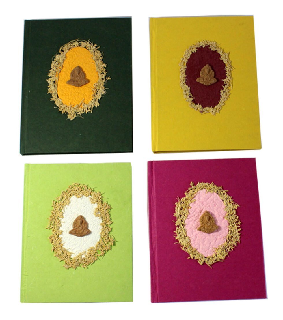 Set of 4 pcs beautiful collage design by gluing down a special paper in oval shape known as ‘Moon Rock’ on the front cover of the notebook. Further surrounded by the auspicious white grass around its border. In the centre, Lord Ganesh – The God of wisdom & Wealth, is placed, making it a very unique Diwali Present! A beautiful aesthetically made symbolic Diwali Present, and very auspicious too, for someone you wish very special! Just inside both the covers, front and back, there is another thick cream colour wood free / acid free paper sheet layer, holding the inside writing pages gracefully. In the middle, 48 sheets / 96 pages for smooth writing which never bleed with the ink or in calligraphy and can be a lovely travel book / art and craft book or a book – keeping domestic accounts and other valuable notes & details.