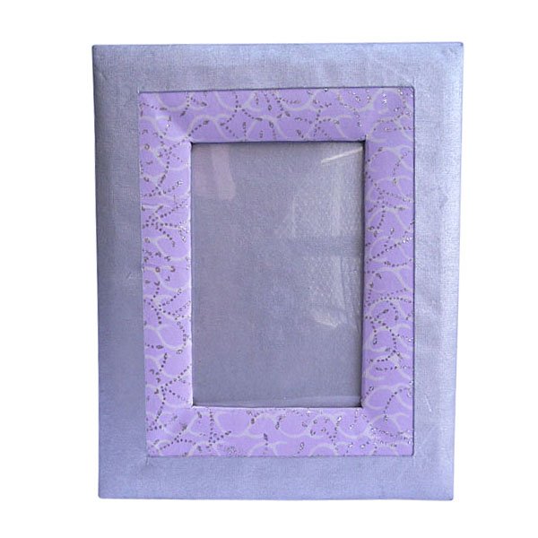 Photo frame made of exclusively silver metallic cotton recycled paper used ornament ally on plain matching recycled cotton handmade paper. Little bit of glitter printed paper too is used in between. Further, foam & cardboard is used to shape it up. A lovely ‘Green Life Style’ product for home decoration. Acetate is provided in the middle to protect photo.
