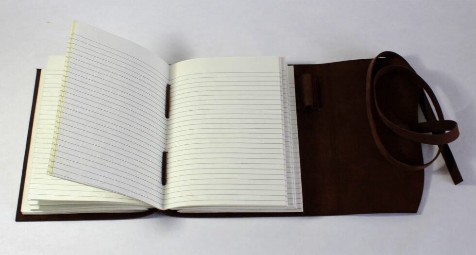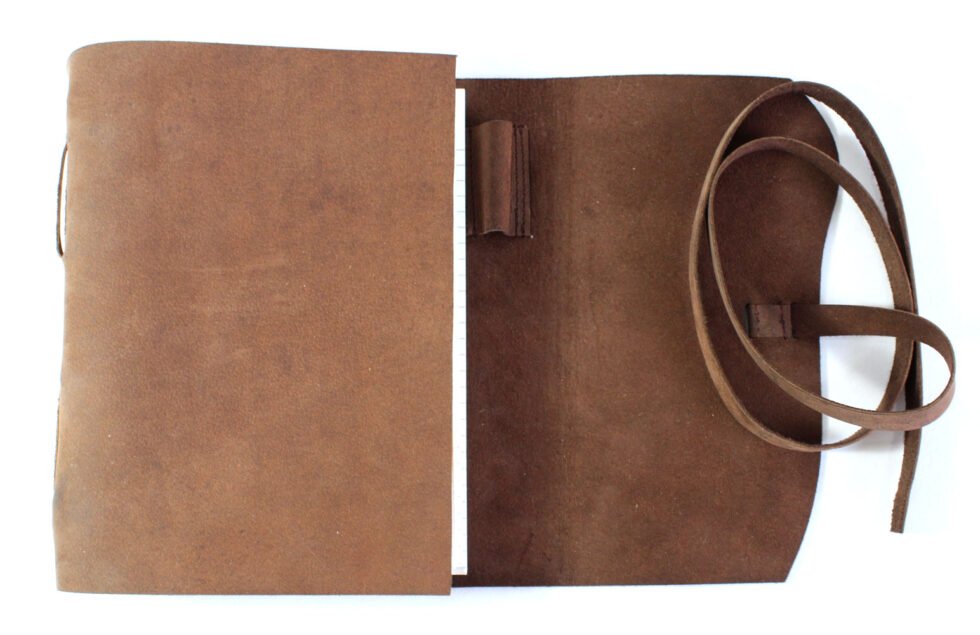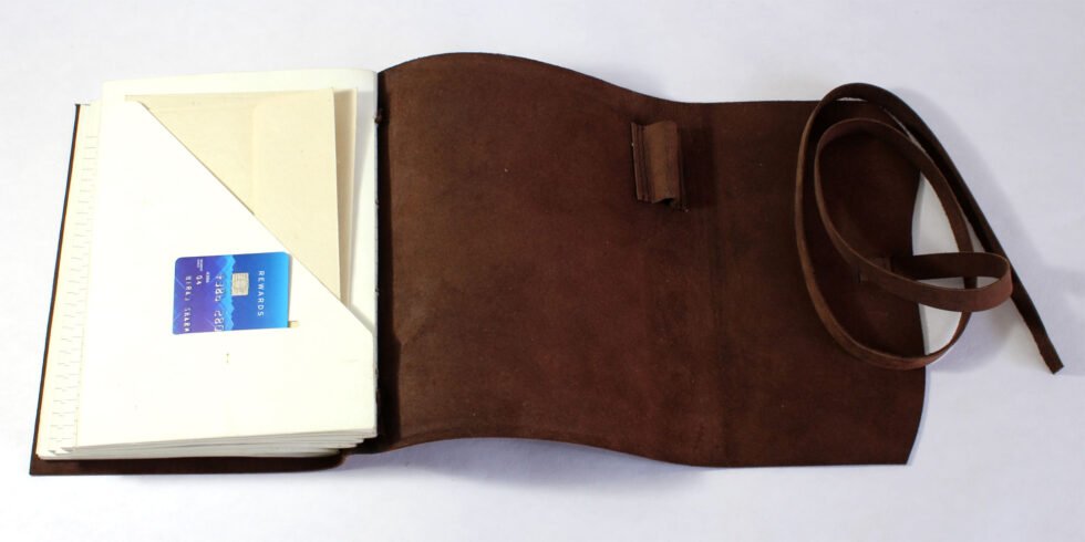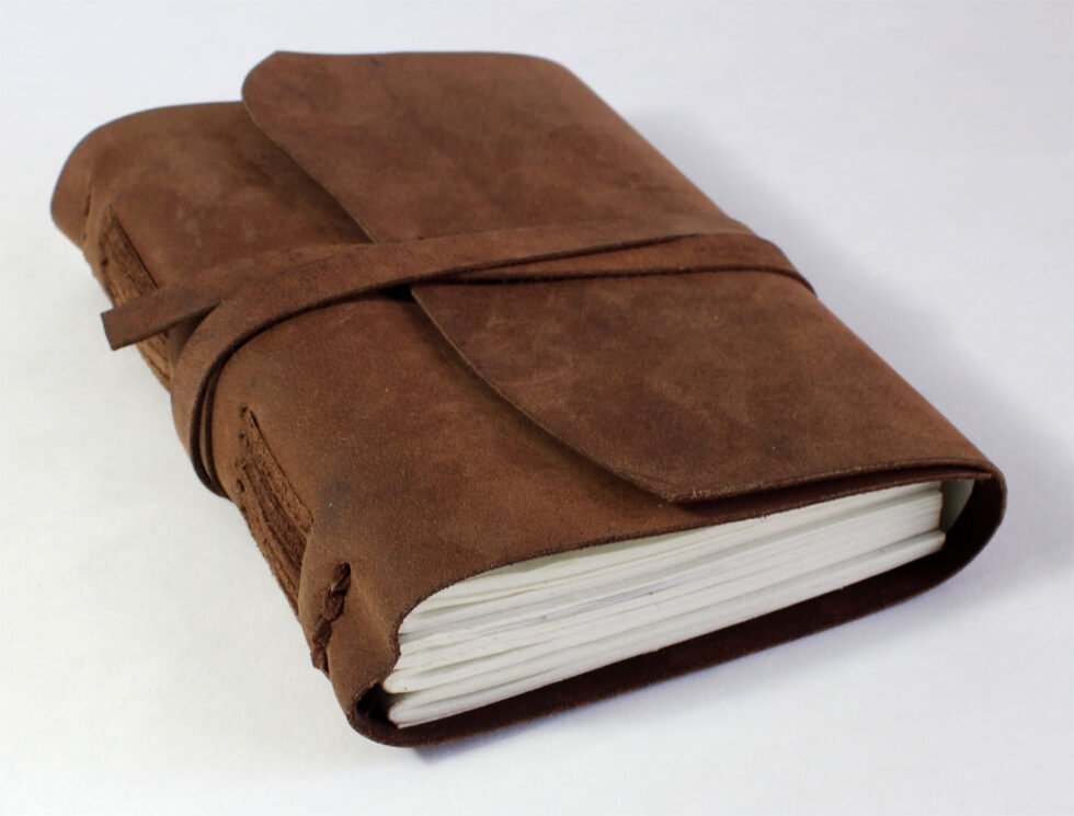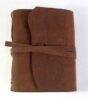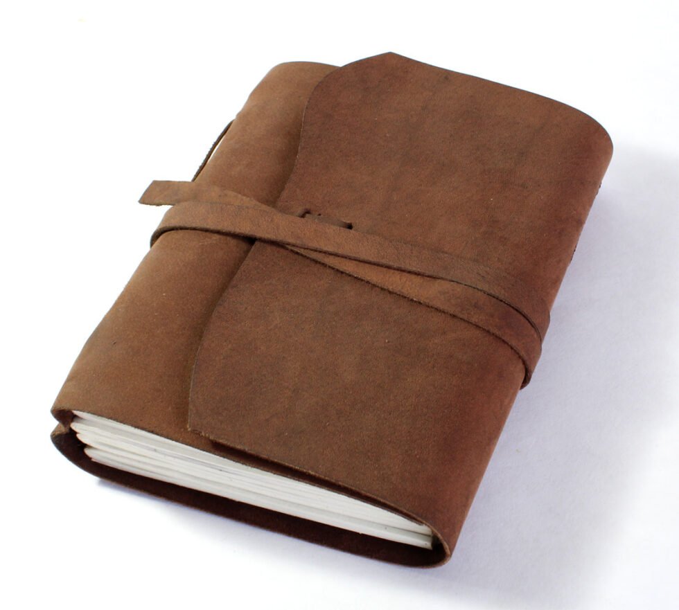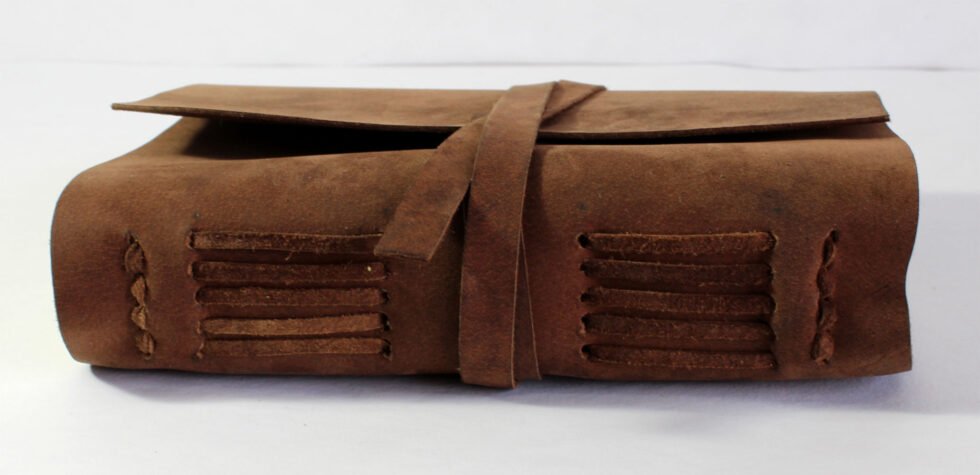 Journal made of leather & paper only as the binding strings are leather too! Soft and supple brown genuine buffalo leather journal with hard bound 150 sheets / 300 pages of recycled cotton handmade paper. Hand crafted journal with 100% natural leather. The leather is naturally distressed and tanned giving a vintage look with a paper folder & credit card holder at the back. A travel journal with rugged & gypsy look, exclusive gift! A 3″ closing flap protects the papers inside with the matching strap around it.