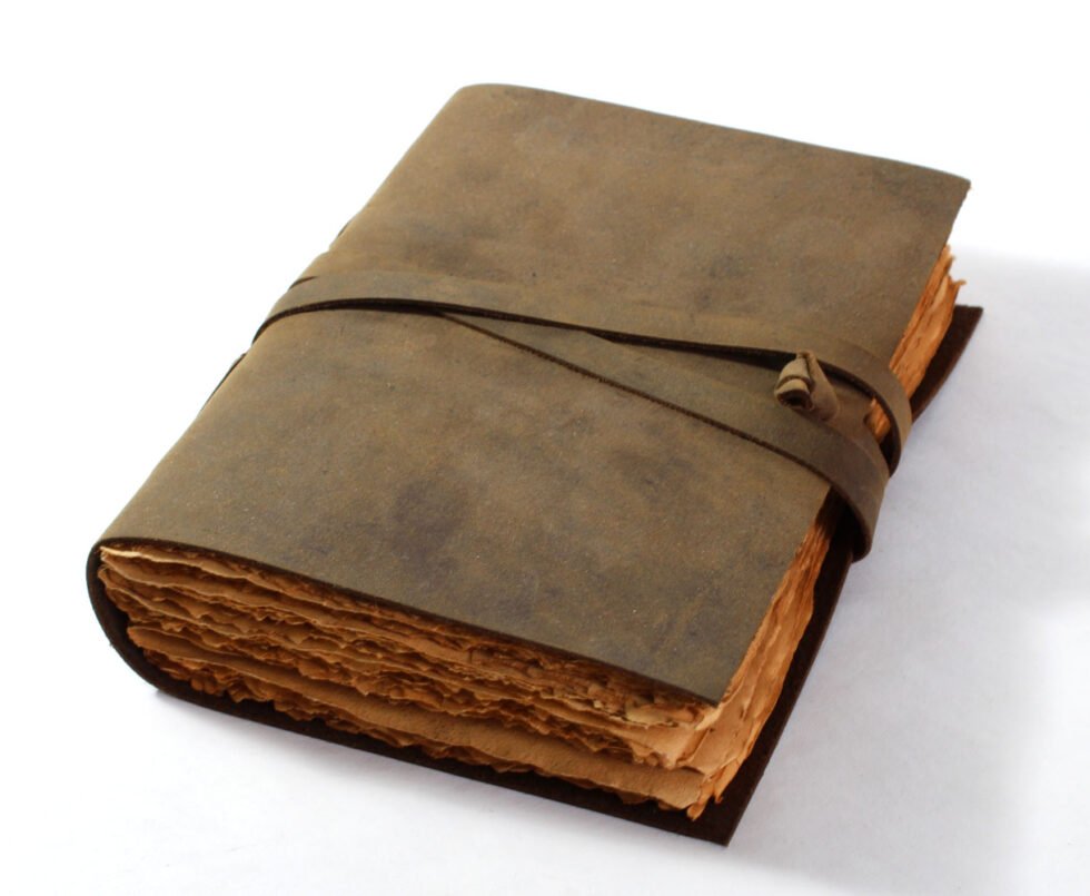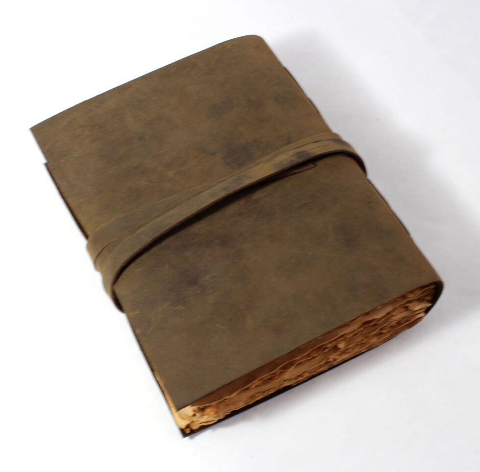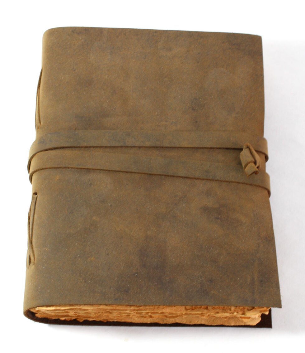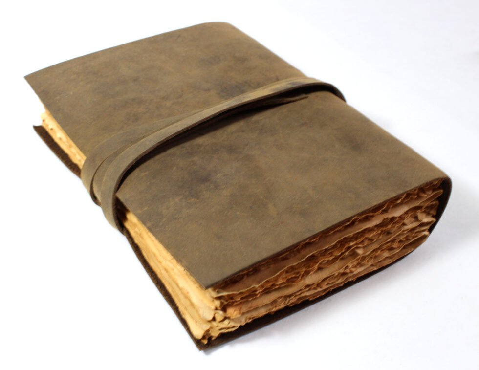 Vintage journal made of leather & paper only as the binding strings are leather too! Soft and supple brown genuine buffalo leather journal with hard bound 120 sheets / 240 pages of recycled handmade cotton paper. Inside, antique aged look, double sided vintage paper made of 120 GSM for durability. Perfect for drawing ancient maps, poetry, medieval-looking writings, menus, themed party & many more! Hand crafted journal with 100% natural leather. The leather is naturally distressed and tanned giving an extra vintage look. A travel journal with rugged & gypsy look, exclusive gift, with the matching strap around it.