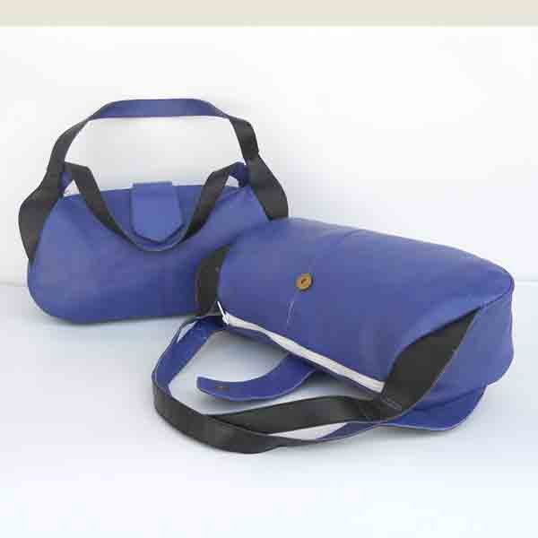 Soft blue color leather with black color leather handles at one side .