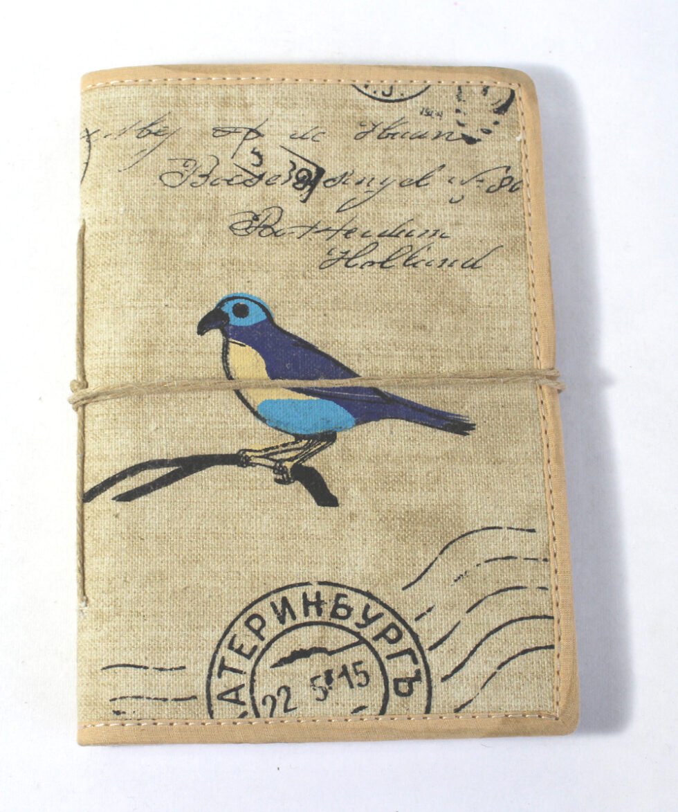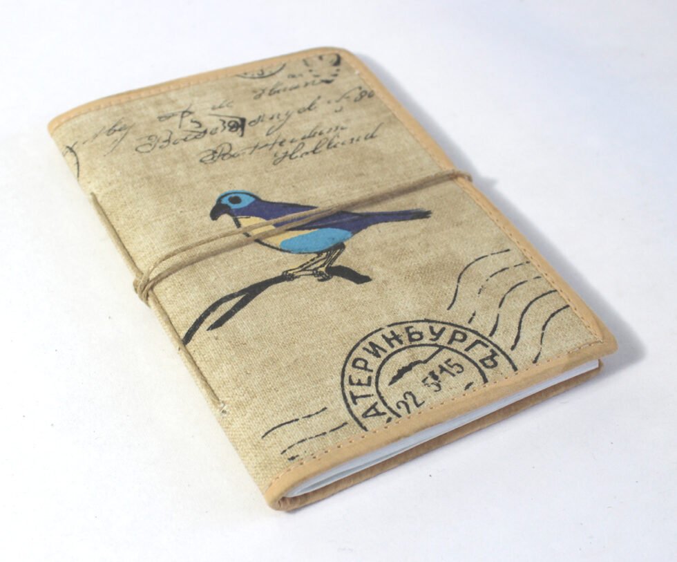 Soft cover antique canvas notebook with 48 sheets (96 pages) of handmade recycled cotton paper, featuring a multicolor bird print and vintage world postal stamps—ideal as a travel journal or a customizable corporate gift.