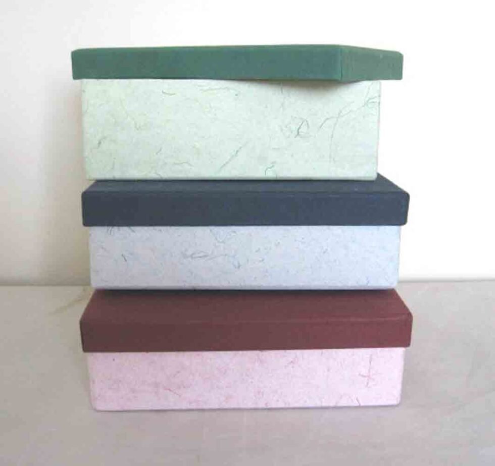 Solid boxes made of card board and plain cotton recycled paper in rectangle shape for gifts and Christmas packaging. Comes in different sizes as sets – nested into each other.