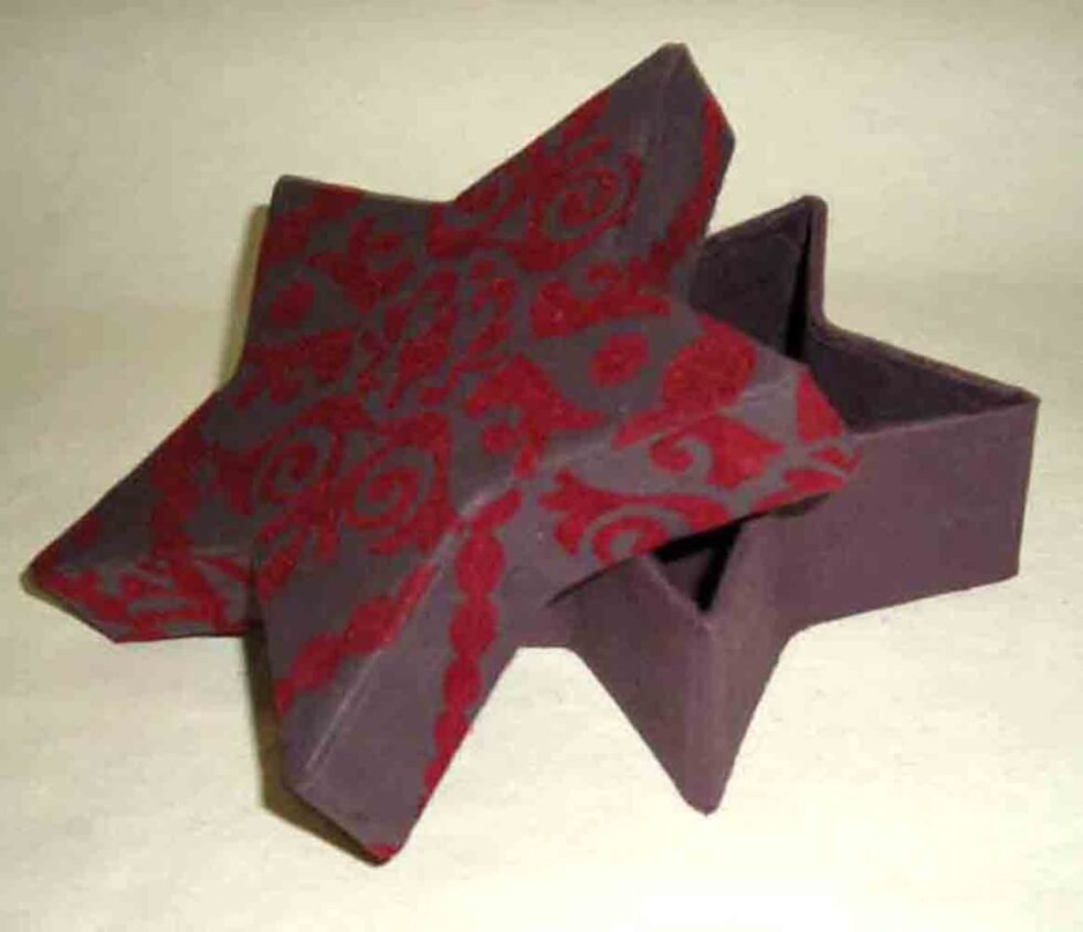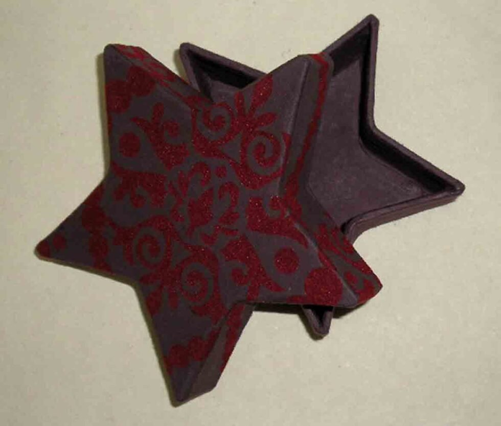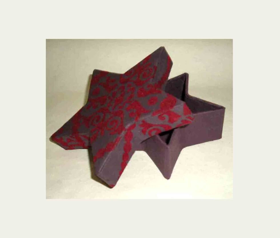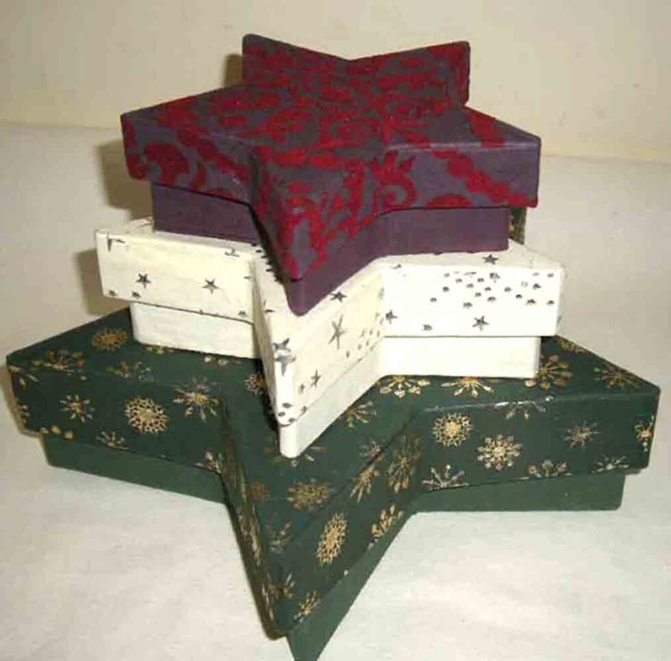 Solid boxes made of card board and velvet printed recycled paper in star shape for gifts and Christmas packaging. Comes in different sizes as sets – nested into each other.